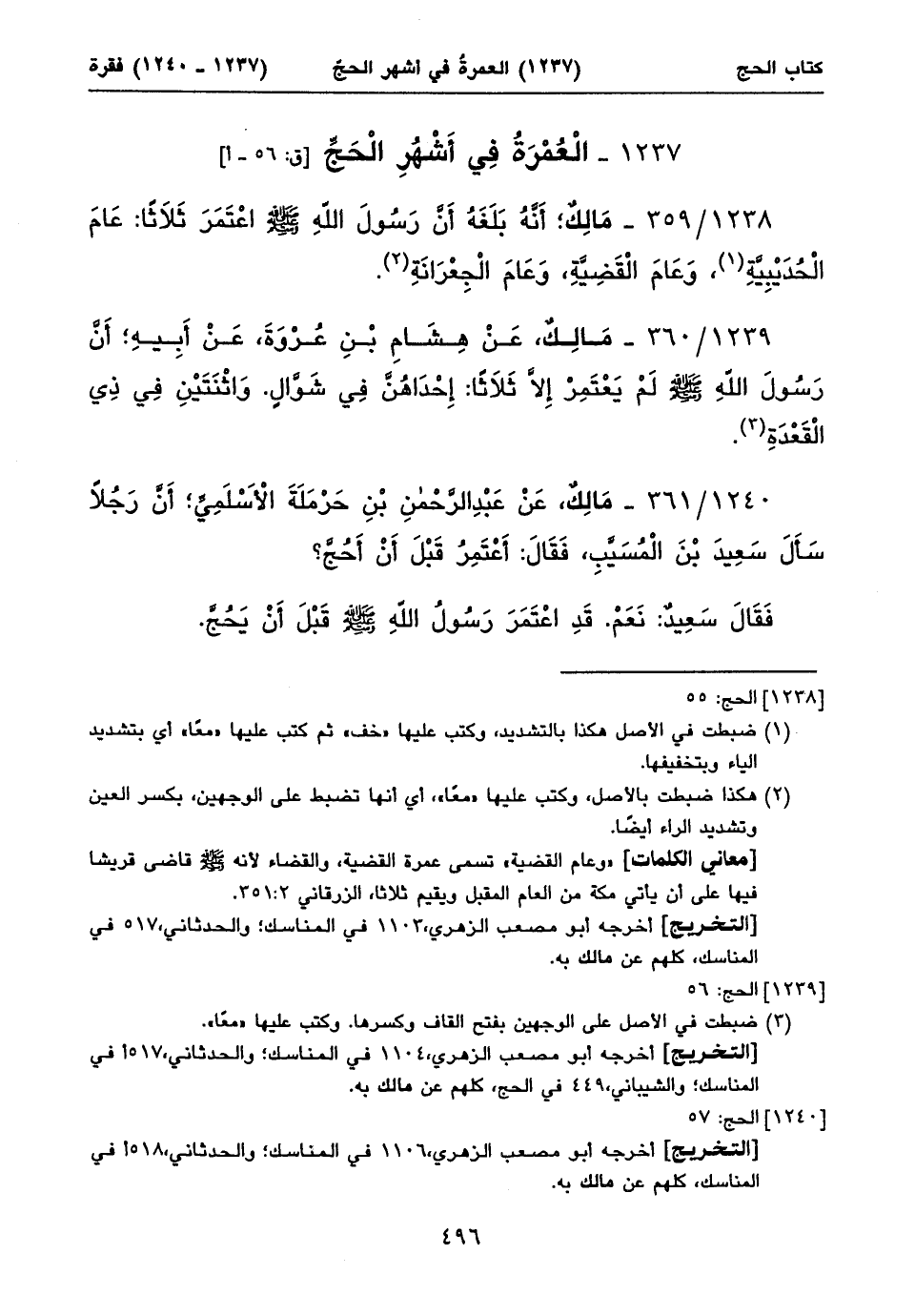 ١٢٣٩/ ٣٦٠ - مَالِكٌ، عَنْ هِشَامِ بْنِ عُرْوَةَ، عَنْ أَبِيهِ؛ أَنَّ رَسُولَ اللهِ صلى الله عليه وسلم لَمْ يَعْتَمِرْ إِلَاّ ثَلَاثاً: إِحْدَاهُنَّ فِي شَوَّالٍ. وَاثْنَتَيْنِ فِي ذِي الْقَعْدَةِ (١).