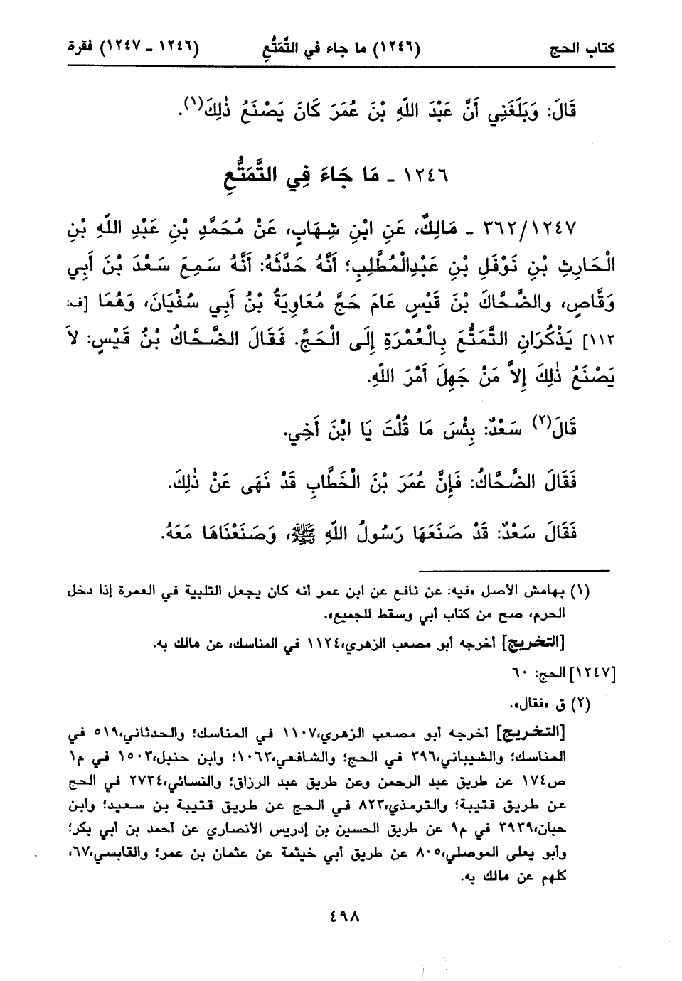 أخرجه أبو مصعب الزهري، ١١٠٧ في المناسك؛ والحدثاني، ٥١٩ في المناسك؛ والشيباني، ٣٩٦ في الحج؛ والشافعي، ١٠٦٣؛ وابن حنبل، ١٥٠٣ في م١ ص١٧٤ عن طريق عبد الرحمن وعن طريق عبد الرزاق؛ والنسائي، ٢٧٣٤ في الحج عن طريق قتيبة؛ والترمذي، ٨٢٣ في الحج عن طريق قتيبة بن سعيد؛ وابن حبان، ٣٩٣٩ في م٩ عن طريق الحسين بن إدريس الأنصاري عن أحمد بن أبي بكر؛ وأبو يعلى الموصلي، ٨٠٥ عن طريق أبي خيثمة عن عثمان بن عمر؛ والقابسي، ٦٧، كلهم عن مالك به.