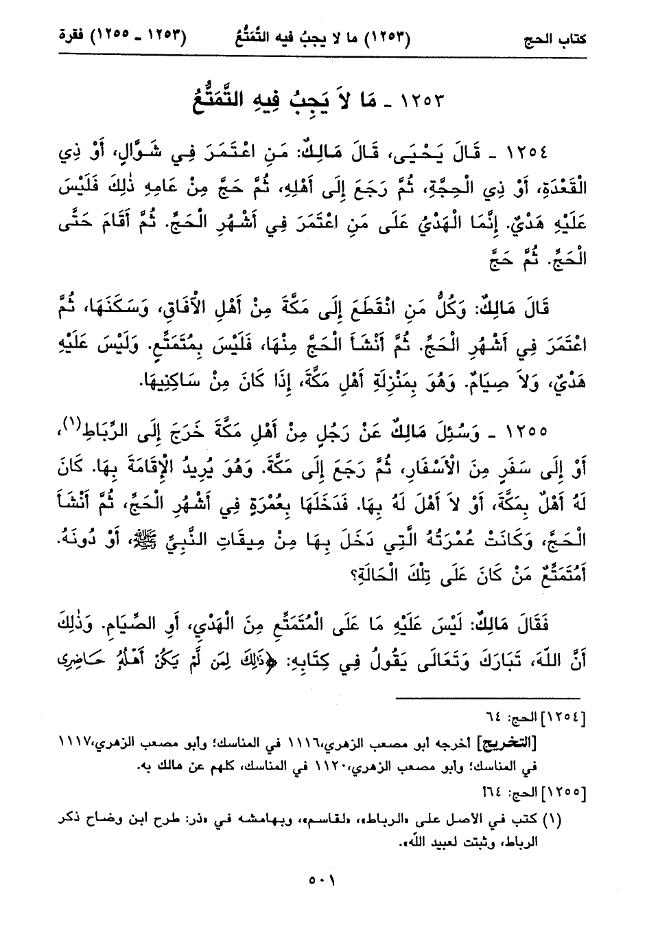 ١٢٥٥ - وَسُئِلَ مَالِكٌ عَنْ رَجُلٍ مِنْ أَهْلِ مَكَّةَ خَرَجَ إِلَى الرِّبَاطِ (١)، أَوْ إِلَى سَفَرٍ مِنَ الْأَسْفَارِ، ثُمَّ رَجَعَ إِلَى مَكَّةَ. وَهُوَ يُرِيدُ الْإِقَامَةَ بِهَا. كَانَ لَهُ أَهْلٌ بِمَكَّةَ، أَوْ لَا أَهْلَ لَهُ بِهَا. فَدَخَلَهَا بِعُمْرَةٍ فِي أَشْهُرِ الْحَجِّ، ثُمَّ أَنْشَأَ الْحَجَّ، وَكَانَتْ عُمْرَتُهُ الَّتِي دَخَلَ بِهَا مِنْ مِيقَاتِ النَّبِيِّ صلى الله عليه وسلم، أَوْ دُونَهُ. أَمُتَمَتِّعٌ مَنْ كَانَ عَلَى تِلْكَ الْحَالَةِ؟