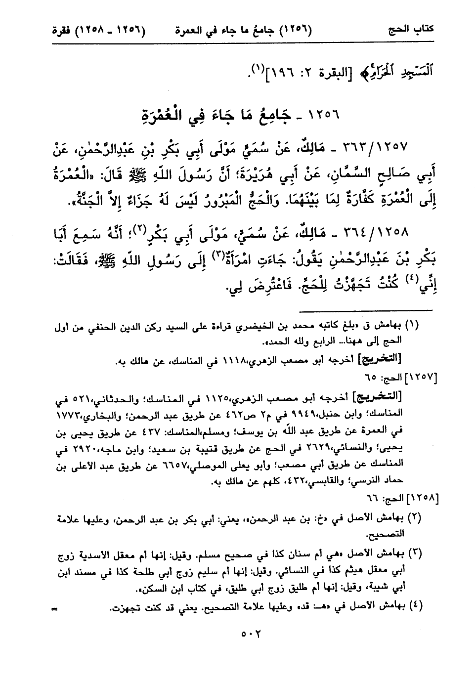 أخرجه أبو مصعب الزهري، ١١٢٥ في المناسك؛ والحدثاني، ٥٢١ في المناسك؛ وابن حنبل، ٩٩٤٩ في م٢ ص٤٦٢ عن طريق عبد الرحمن؛ والبخاري، ١٧٧٣ في العمرة عن طريق عبد الله بن يوسف؛ ومسلم، المناسك: ٤٣٧ عن طريق يحيى بن يحيى؛ والنسائي، ٢٦٢٩ في الحج عن طريق قتيبة بن سعيد؛ وابن ماجه، ٢٩٢٠ في المناسك عن طريق أبي مصعب؛ وأبو يعلى الموصلي، ٦٦٥٧ عن طريق عبد الأعلى بن حماد النرسي؛ والقابسي، ٤٣٢، كلهم عن مالك به.