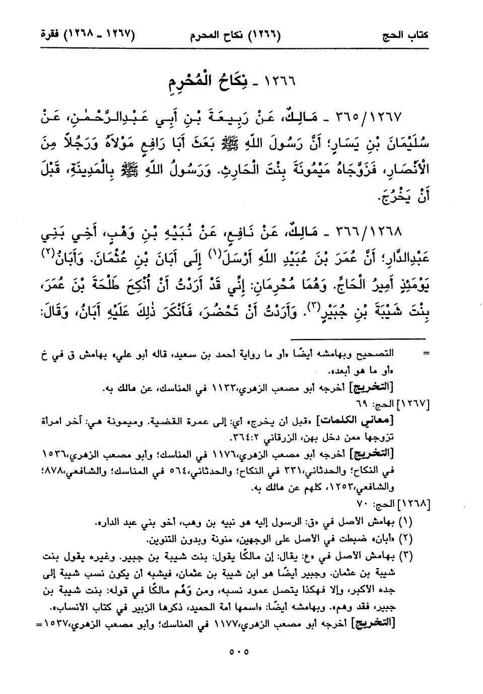 ١٢٦٨/ ٣٦٦ - مَالِكٌ، عَنْ نَافِعٍ، عَنْ نُبَيْهِ بْنِ وَهْبٍ، أَخِي بَنِي عَبْدِ الدَّارِ؛ أَنَّ عُمَرَ بْنَ عُبَيْدِ اللهِ أَرْسَلَ (١) إِلَى أَبَانَ بْنِ عُثْمَانَ. وَأَبَانُ (٢) يَوْمَئِذٍ أَمِيرُ الْحَاجِّ. وَهُمَا مُحْرِمَانِ: إِنِّي قَدْ أَرَدْتُ أَنْ أُنْكِحَ طَلْحَةَ بْنَ عُمَرَ، بِنْتَ شَيْبَةَ بْنِ جُبَيْرٍ (٣). وَأَرَدْتُ أَنْ تَحْضُرَ، فَأَنْكَرَ ذلِكَ عَلَيْهِ أَبَانُ، وَقَالَ: ⦗٥٠٦⦘ سَمِعْتُ عُثْمَانَ بْنَ عَفَّانَ يَقُولُ: قَالَ رَسُولُ اللهِ صلى الله عليه وسلم: «لَا يَنْكِحِ الْمُحْرِمُ، وَلَا يُنْكِحْ، وَلَا يَخْطُبْ».