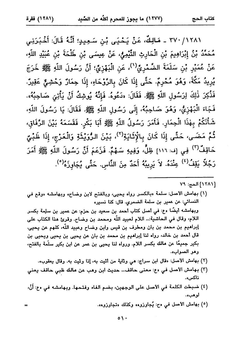 ١٢٨١/ ٣٧٠ - مَالِكٌ، عَنْ يَحْيَى بْنِ سَعِيدٍ؛ أَنَّهُ قَالَ: أَخْبَرَنِي مُحَمَّدُ بْنُ إِبْرَاهِيمَ بْنِ الْحَارِثِ التَّيْمِيُّ، عَنْ عِيسَى بْنِ طَلْحَةَ بْنِ عُبَيْدِ اللهِ، عَنْ عُمَيْرِ بْنِ سَلَمَةَ الضَّمْرِيِّ (١)، عَنِ الْبَهْزِيِّ؛ أَنَّ رَسُولَ اللهِ صلى الله عليه وسلم خَرَجَ يُرِيدُ مَكَّةَ، وَهُوَ مُحْرِمٌ. حَتَّى إِذَا كَانَ بِالرَّوْحَاءِ، إِذَا حِمَارٌ وَحْشِيٌّ عَقِيرٌ. فَذُكِرَ ذلِكَ لِرَسُولِ اللهِ صلى الله عليه وسلم. فَقَالَ: «دَعُوهُ. فَإِنَّهُ يُوشِكُ أَنْ يَأْتِيَ صَاحِبُهُ». فَجَاءَ الْبَهْزِيُّ، وَهُوَ صَاحِبُهُ، إِلَى رَسُولِ اللهِ صلى الله عليه وسلم. فَقَالَ: يَا رَسُولَ اللهِ، شَأْنَكُمْ بِهذَا الْحِمَارِ. فَأَمَرَ رَسُولُ اللهِ صلى الله عليه وسلم أَبَا بَكْرٍ. فَقَسَمَهُ بَيْنَ الرِّفَاقِ، ثُمَّ مَضَى، حَتَّى إِذَا كَانَ بِالْإِثَايَةِ (٢)، بَيْنَ الرُّوَيْثَةِ وَالْعَرْجِ، إِذَا ظَبْيٌ حَاقِفٌ (٣) فِي [ف: ١١٦] ظِلٍّ، وَفِيهِ سَهْمٌ. فَزَعَمَ أَنَّ رَسُولَ اللهِ صلى الله عليه وسلم أَمَرَ رَجُلاً يَقِفُ (٤) عِنْدَهُ. لَا يَرِيبُهُ أَحَدٌ مِنَ النَّاسِ. حَتَّى يُجَاوِزَهُ (٥).