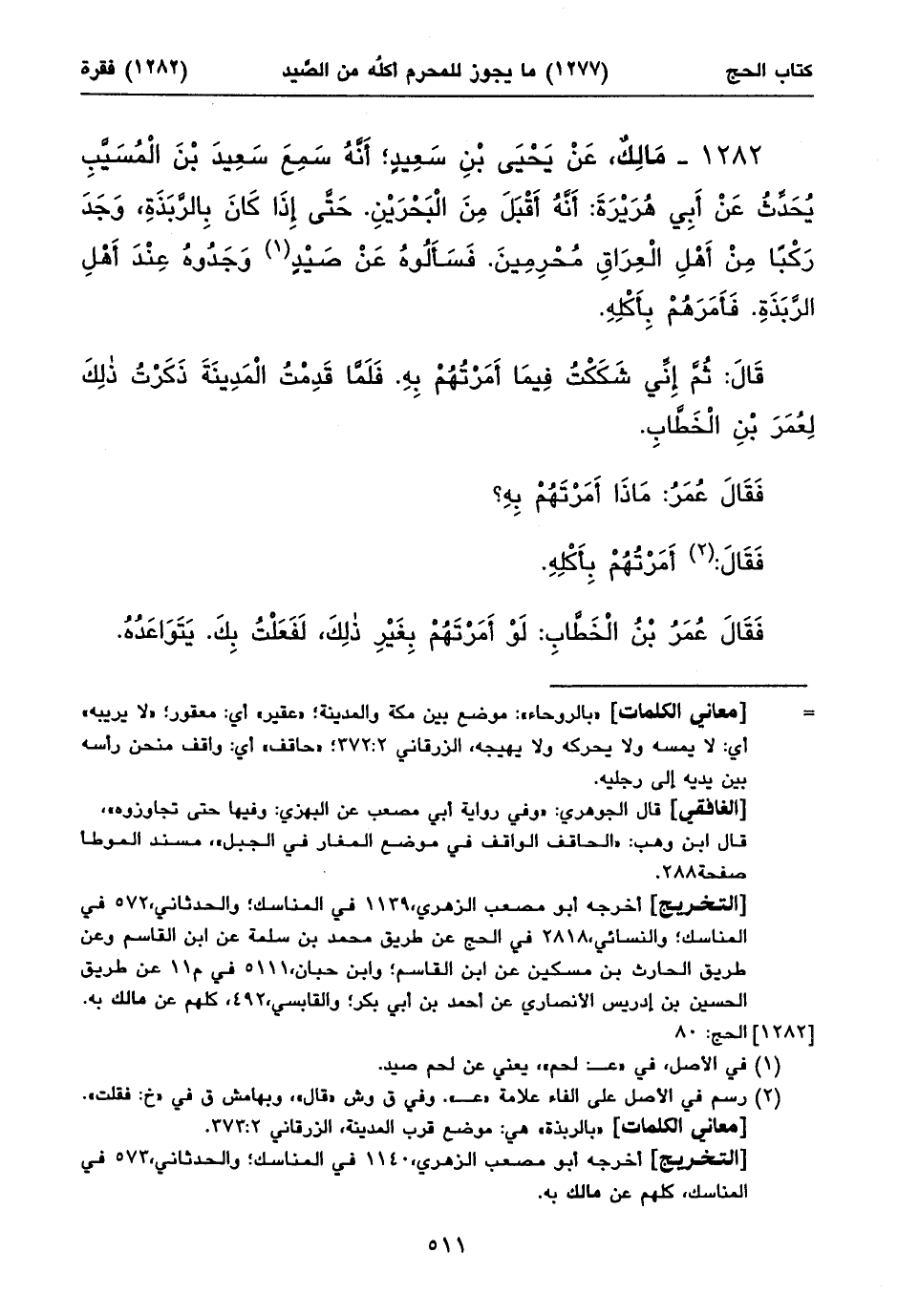١٢٨٢ - مَالِكٌ، عَنْ يَحْيَى بْنِ سَعِيدٍ؛ أَنَّهُ سَمِعَ سَعِيدَ بْنَ الْمُسَيَّبِ يُحَدِّثُ عَنْ أَبِي هُرَيْرَةَ: أَنَّهُ أَقْبَلَ مِنَ الْبَحْرَيْنِ. حَتَّى إِذَا كَانَ بِالرَّبَذَةِ، وَجَدَ رَكْباً مِنْ أَهْلِ الْعِرَاقِ مُحْرِمِينَ. فَسَأَلُوهُ عَنْ صَيْدٍ (١) وَجَدُوهُ عِنْدَ أَهْلِ الرَّبَذَةِ. فَأَمَرَهُمْ بِأَكْلِهِ.