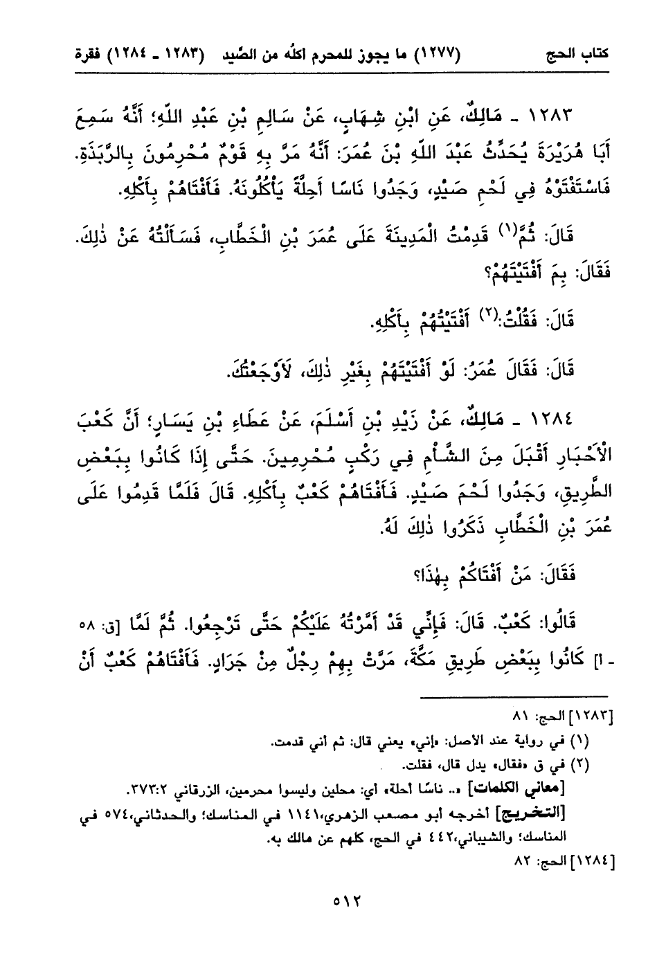 ١٢٨٤ - مَالِكٌ، عَنْ زَيْدِ بْنِ أَسْلَمَ، عَنْ عَطَاءِ بْنِ يَسَارٍ؛ أَنَّ كَعْبَ الْأَحْبَارِ أَقْبَلَ مِنَ الشَّأْمِ فِي رَكْبٍ مُحْرِمِينَ. حَتَّى إِذَا كَانُوا بِبَعْضِ الطَّرِيقِ، وَجَدُوا لَحْمَ صَيْدٍ. فَأَفْتَاهُمْ كَعْبٌ بِأَكْلِهِ.