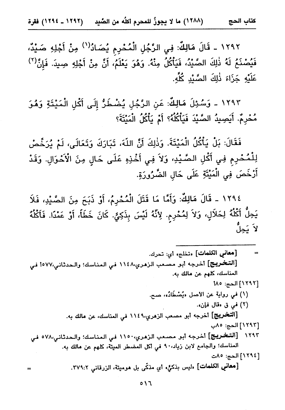 ١٢٩٣ - وَسُئِلَ مَالِكٌ: عَنِ الرَّجُلِ يُضْطَرُّ إِلَى أَكْلِ الْمَيْتَةِ وَهُوَ مُحْرِمٌ. أَيَصِيدُ الصَّيْدَ فَيَأْكُلُهُ؟ أَمْ يَأْكُلُ الْمَيْتَةَ؟