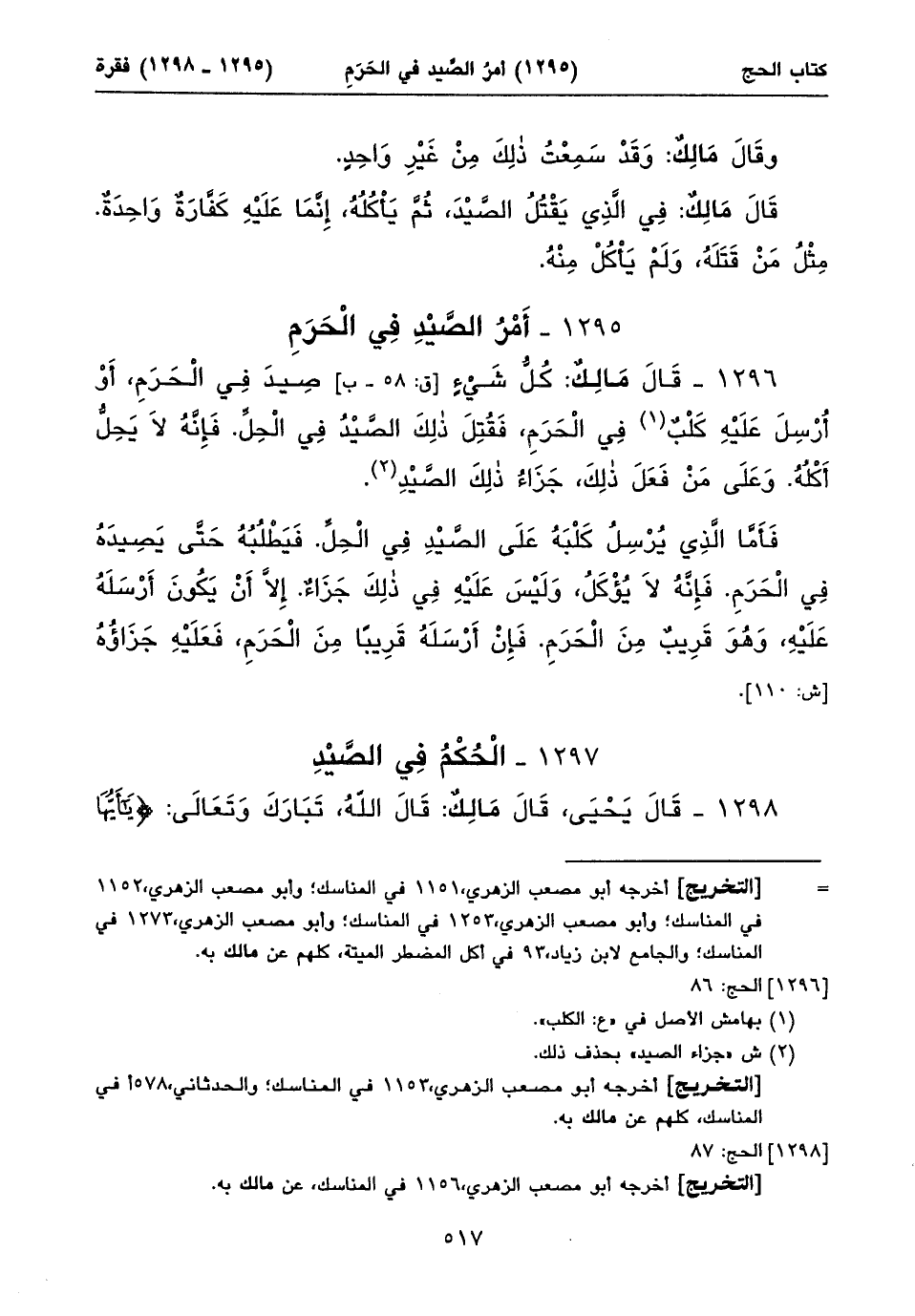 ١٢٩٨ - قَالَ يَحْيَى، قَالَ مَالِكٌ: قَالَ اللهُ، تَبَارَكَ وَتَعَالَى: {يّا أّيُّهَا ⦗٥١٨⦘ الَّذِينَ آمَنُوا لا تَقْتُلُوا الصَّيدَ وَأَنْتُمْ حُرُمٌ وَمَن قَتَلَهُ مِنْكُم مُتَعَمِّداً فَجَزَاءٌ مِثْلُ مَا قَتَلَ مِنَ النَّعَمِ يَحْكُمُ بِهِ ذَوَا عَدْلٍ مِنْكُمْ هَدياً بَالِغَ الكَعْبَةِ أَو كَفَّارَةٌ طَعَامُ مِسْكِينَ أَو عَدْلُ ذَلِكَ صِيَاماً لِيَذُوقَ وَبَالَ أَمْرِهِ} [المائدة ٥: ٩٥]، قَالَ مَالِكٌ: فَالَّذِي يَصِيدُ الصَّيْدَ وَهُوَ حَلَالٌ، ثُمَّ يَقْتُلُهُ وَهُوَ مُحْرِمٌ. بِمَنْزِلَةِ الَّذِي يَبْتَاعُهُ وَهُوَ مُحْرِمٌ، ثُمَّ يَقْتُلُهُ. وَقَدْ نَهَى اللهُ عَنْ قَتْلِهِ. فَعَلَيْهِ جَزَاؤُهُ.