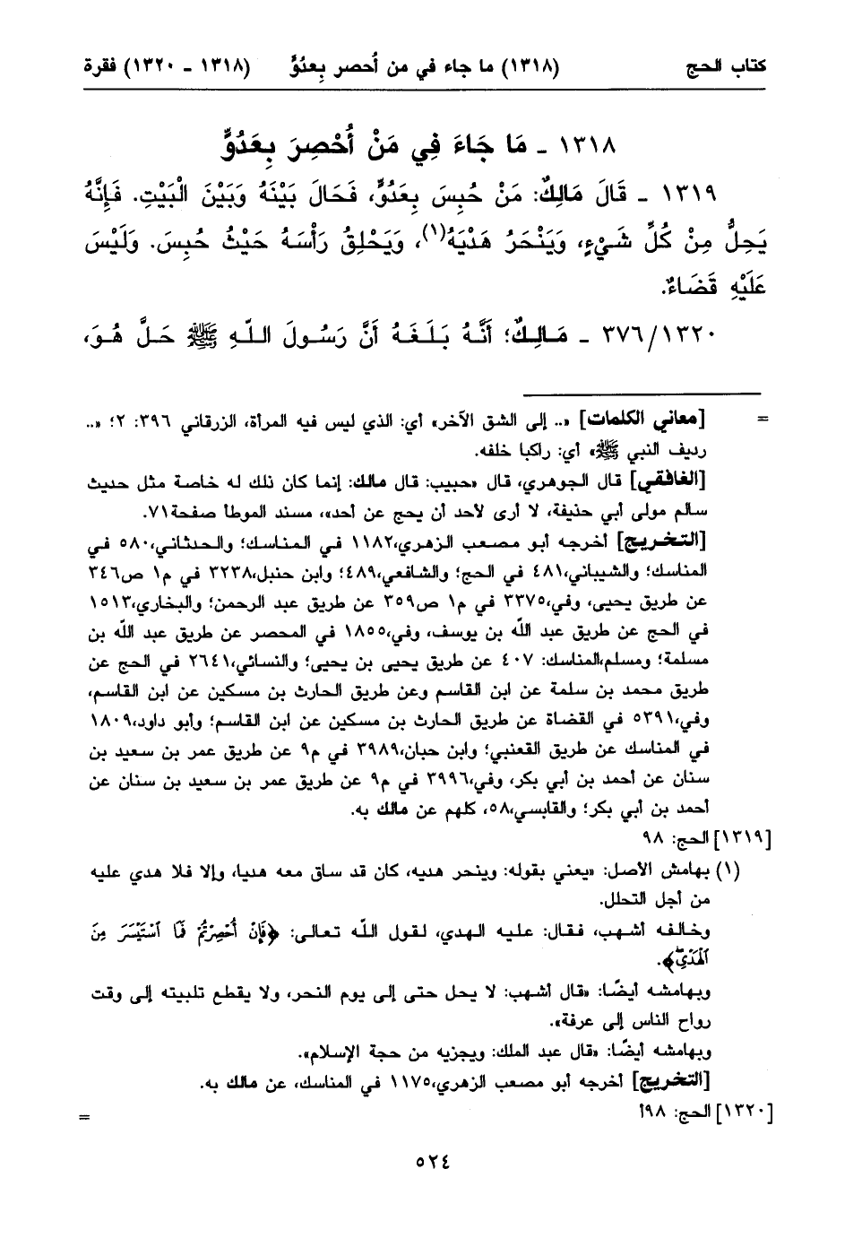 ١٣١٩ - قَالَ مَالِكٌ: مَنْ حُبِسَ بِعَدُوٍّ، فَحَالَ بَيْنَهُ وَبَيْنَ الْبَيْتِ. فَإِنَّهُ يَحِلُّ مِنْ كُلِّ شَيْءٍ، وَيَنْحَرُ هَدْيَهُ (١)، وَيَحْلِقُ رَأْسَهُ حَيْثُ حُبِسَ. وَلَيْسَ عَلَيْهِ قَضَاءٌ.