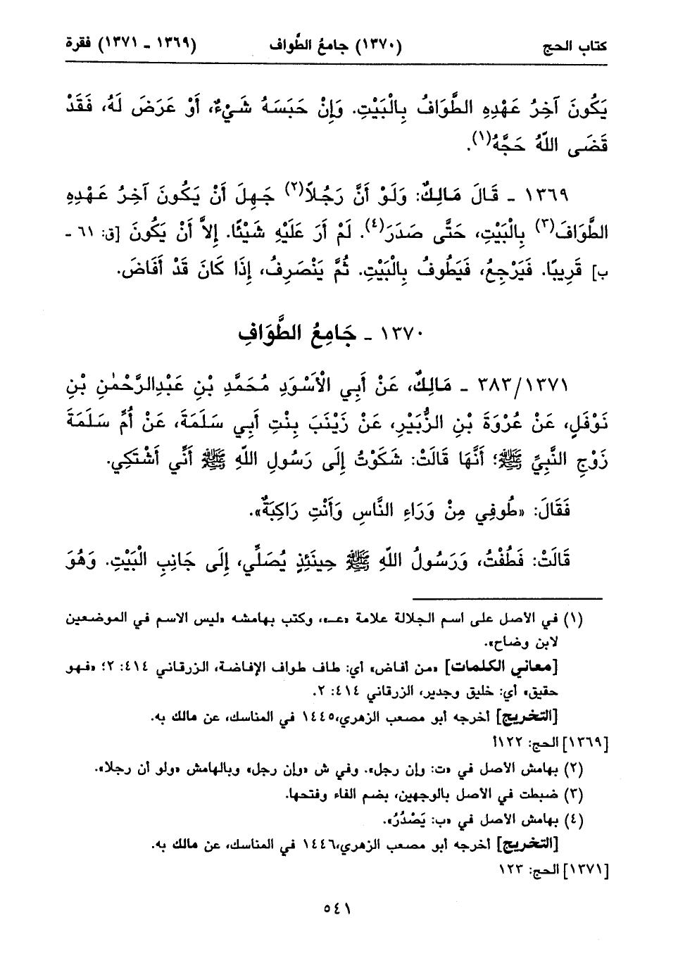أخرجه أبو مصعب الزهري، ١٣٠٢ في المناسك؛ والحدثاني، ٥٥٢ في المناسك؛ والشيباني، ٤٧٦ في الحج؛ وابن حنبل، ٢٦٥٢٨ في م٦ ص٢٩٠ عن طريق عبد الرحمن، وفي، ٢٦٧٥٧ في م٦ ص٣١٩ عن طريق عبد الرحمن؛ والبخاري، ٤٦٤ في الصلاة عن طريق عبد الله بن يوسف، وفي، ١٦١٩ في الحج عن طريق إسماعيل، وفي، ١٦٣٣ في الحج عن طريق عبد الله بن مسلمة، وفي، ٤٨٥٣ في التفسير عن طريق عبد الله بن يوسف؛ ومسلم، المناسك: ٢٥٨ عن طريق يحيى بن يحيى؛ والنسائي، ٢٩٢٥ في الحج عن طريق محمد بن سلمة عن القاسم وعن طريق الحارث بن مسكين عن القاسم، وفي، ٢٩٢٧ في الحج عن طريق عبيد الله بن سعيد عن عبد الرحمن؛ وأبو داود، ١٨٨٢ في المناسك عن طريق القعنبي؛ وابن ماجه، ٢٩٩٤ في المناسك عن طريق أبي بكر بن أبي شيبة عن معلى بن منصور عن إسحاق بن منصور عن عبد الرحمن بن مهدي وعن طريق أبي بكر بن أبي شيبة عن معلى بن منصور عن أحمد بن سنان عن عبد الرحمن بن مهدي؛ وابن حبان، ٣٨٣٠ في م٩ عن طريق محمد بن أحمد بن الرقام عن نصر بن علي الجهضمي عن معن بن عيسى، وفي، ٣٨٣٣ في م٩ عن طريق عمر بن سعيد بن سنان عن أحمد بن أبي بكر؛ والمنتقى