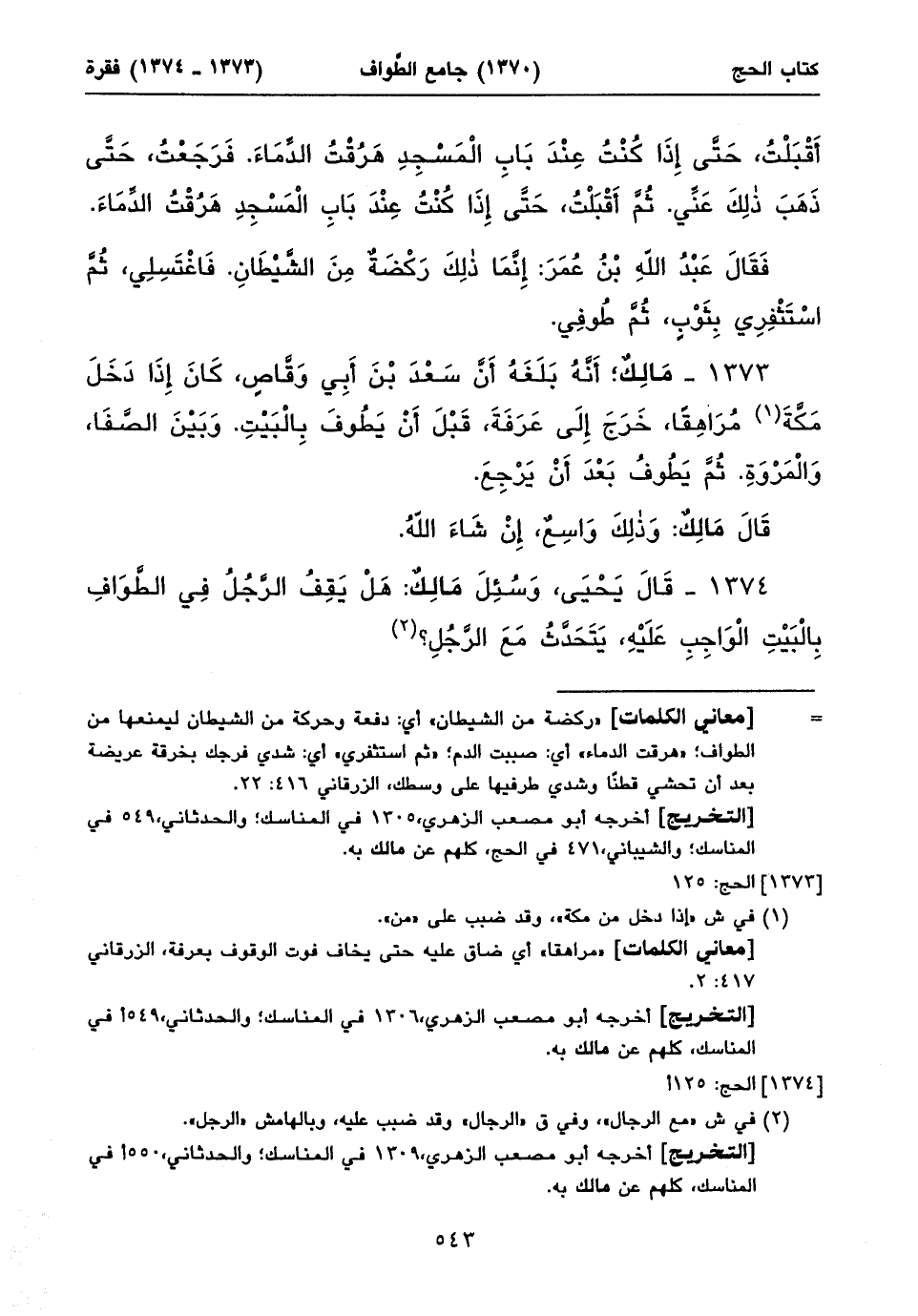 ١٣٧٤ - قَالَ يَحْيَى، وَسُئِلَ مَالِكٌ: هَلْ يَقِفُ الرَّجُلُ فِي الطَّوَافِ بِالْبَيْتِ الْوَاجِبِ عَلَيْهِ، يَتَحَدَّثُ مَعَ الرَّجُلِ؟ (١) ⦗٥٤٤⦘