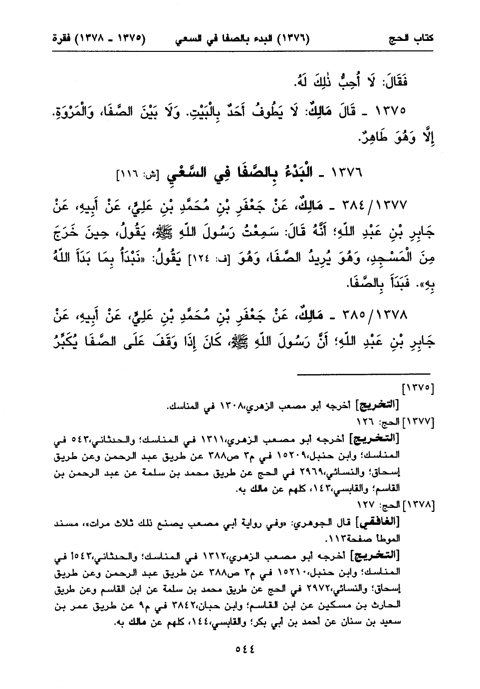 ١٣٧٨/ ٣٨٥ - مَالِكٌ، عَنْ جَعْفَرِ بْنِ مُحَمَّدِ بْنِ عَلِيٍّ، عَنْ أَبِيهِ، عَنْ جَابِرِ بْنِ عَبْدِ اللهِ؛ أَنَّ رَسُولَ اللهِ صلى الله عليه وسلم، كَانَ إِذَا وَقَفَ عَلَى الصَّفَا يُكَبِّرُ ⦗٥٤٥⦘ ثَلَاثاً. وَيَقُولُ: «لَا إِلَهَ إِلَاّ اللهُ وَحْدَهُ. لَا شَرِيكَ لَهُ. لَهُ الْمُلْكُ، وَلَهُ الْحَمْدُ، وَهُوَ عَلَى كُلِّ شَيْءٍ قَدِيرٌ». يَصْنَعُ ذلِكَ ثَلَاثَ مَرَّاتٍ. وَيَدْعُو. وَيَصْنَعُ عَلَى الْمَرْوَةِ مِثْلَ ذلِكَ.