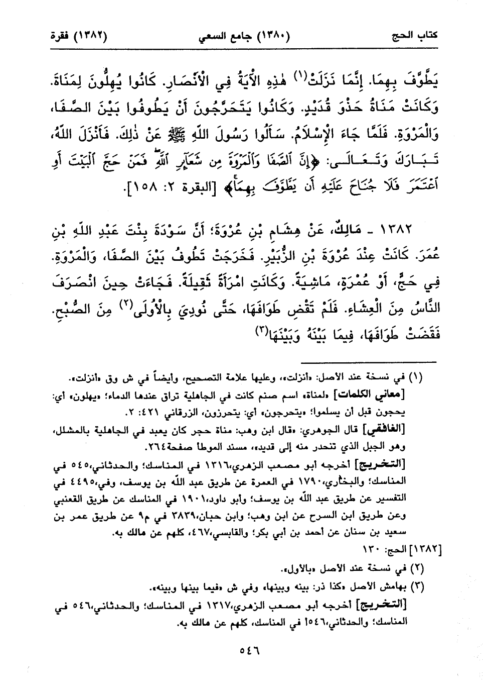 ١٣٨٢ - مَالِكٌ، عَنْ هِشَامِ بْنِ عُرْوَةَ؛ أَنَّ سَوْدَةَ بِنْتَ عَبْدِ اللهِ بْنِ عُمَرَ. كَانَتْ عِنْدَ عُرْوَةَ بْنِ الزُّبَيْرِ. فَخَرَجَتْ تَطُوفُ بَيْنَ الصَّفَا، وَالْمَرْوَةِ. فِي حَجٍّ، أَوْ عُمْرَةٍ، مَاشِيَةً. وَكَانَتِ امْرَأَةً ثَقِيلَةً. فَجَاءَتْ حِينَ انْصَرَفَ النَّاسُ مِنَ الْعِشَاءِ. فَلَمْ تَقْضِ طَوَافَهَا، حَتَّى نُودِيَ بِالْأُولَى (١) مِنَ الصُّبْحِ. فَقَضَتْ طَوَافَهَا، فِيمَا بَيْنَهُ وَبَيْنَهَا (٢) ⦗٥٤٧⦘