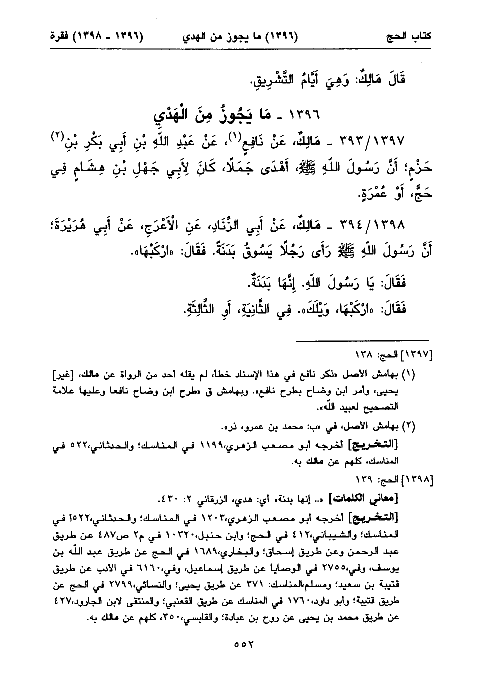 أخرجه أبو مصعب الزهري، ١٢٠٣ في المناسك؛ والحدثاني، ٥٢٢أفي المناسك؛ والشيباني، ٤١٢ في الحج؛ وابن حنبل، ١٠٣٢٠ في م٢ ص٤٨٧ عن طريق عبد الرحمن وعن طريق إسحاق؛ والبخاري، ١٦٨٩ في الحج عن طريق عبد الله بن يوسف، وفي، ٢٧٥٥ في الوصايا عن طريق إسماعيل، وفي، ٦١٦٠ في الأدب عن طريق قتيبة بن سعيد؛ ومسلم، المناسك: ٣٧١ عن طريق يحيى؛ والنسائي، ٢٧٩٩ في الحج عن طريق قتيبة؛ وأبو داود، ١٧٦٠ في المناسك عن طريق القعنبي؛ والمنتقى لابن الجارود، ٤٢٧ عن طريق محمد بن يحيى عن روح بن عبادة؛ والقابسي، ٣٥٠، كلهم عن مالك به.