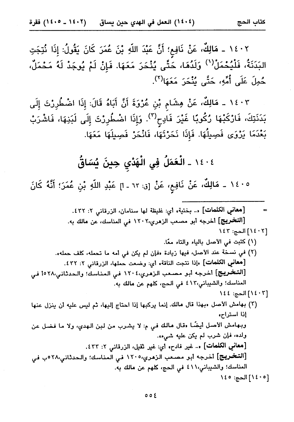 ١٤٠٥ - مَالِكٌ، عَنْ نَافِعٍ، عَنْ [ق: ٦٣ - أ] عَبْدِ اللهِ بْنِ عُمَرَ؛ أَنَّهُ كَانَ ⦗٥٥٥⦘ إِذَا أَهْدَى هَدْياً مِنَ الْمَدِينَةِ. قَلَّدَهُ، وَأَشْعَرَهُ بِذِي الْحُلَيْفَةِ. يُقَلِّدُهُ قَبْلَ أَنْ يُشْعِرَهُ. وَذلِكَ فِي مَكَانٍ وَاحِدٍ. وَهُوَ مُوَجَّهٌ لِلْقِبْلَةِ (١). يُقَلِّدُهُ بِنَعْلَيْنِ، وَيُشْعِرُهُ مِنَ الشِّقِّ الْأَيْسَرِ. ثُمَّ يُسَاقُ مَعَهُ، حَتَّى يُوقَفَ بِهِ مَعَ النَّاسِ بِعَرَفَةَ. ثُمَّ يُدْفَعُ بِهِ مَعَهُمْ إِذَا دَفَعُوا. فَإِذَا قَدِمَ مِنًى غَدَاةَ النَّحْرِ، نَحَرَهُ قَبْلَ أَنْ يَحْلِقَ، أَوْ يُقَصِّرَ. وَكَانَ هُوَ يَنْحَرُ هَدْيَهُ بِيَدِهِ. يَصُفُّهُنََ قِيَاماً، وَيُوَجِّهُهُنَّ (٢) الْقِبْلَةَ. ثُمَّ يَأْكُلُ، وَيُطْعِمُ.
