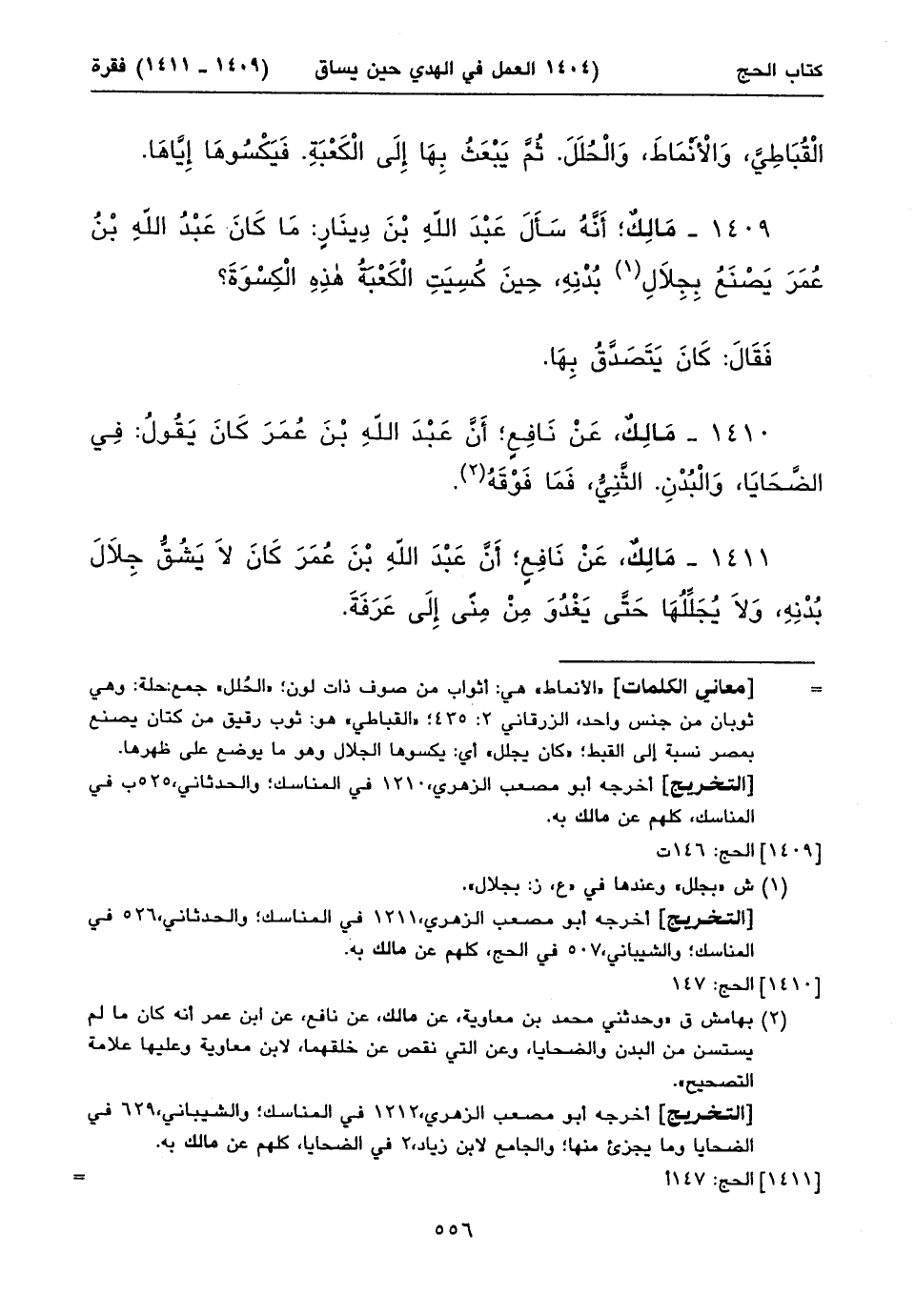 ١٤١١ - مَالِكٌ، عَنْ نَافِعٍ؛ أَنَّ عَبْدَ اللهِ بْنَ عُمَرَ كَانَ لَا يَشُقُّ جِلَالَ بُدْنِهِ، وَلَا يُجَلِّلُهَا حَتَّى يَغْدُوَ مِنْ مِنًى إِلَى عَرَفَةَ.