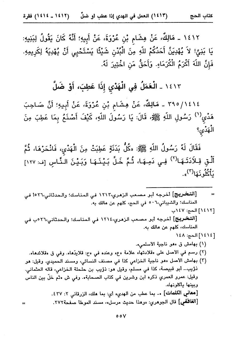 ١٤١٤/ ٣٩٥ - مَالِكٌ، عَنْ هِشَامِ بْنِ عُرْوَةَ، عَنْ أَبِيهِ؛ أَنَّ صَاحِبَ هَدْيِ (١) رَسُولِ اللهِ صلى الله عليه وسلم، قَالَ: يَا رَسُولَ اللهِ، كَيْفَ أَصْنَعُ بِمَا عَطِبَ مِنَ الْهَدْيِ؟