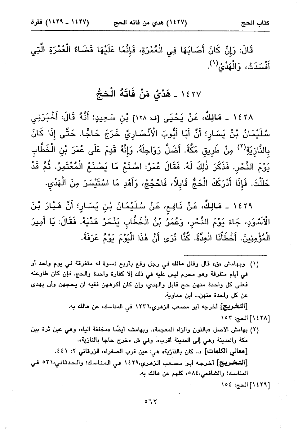 ١٤٢٨ - مَالِكٌ، عَنْ يَحْيَى [ف: ١٢٨] بْنِ سَعِيدٍ؛ أَنَّهُ قَالَ: أَخْبَرَنِي سُلَيْمَانُ بْنُ يَسَارٍ؛ أَنَّ أَبَا أَيُّوبَ الْأَنْصَارِيَّ خَرَجَ حَاجّاً. حَتَّى إِذَا كَانَ بِالنَّازِيَةِ (١) مِنْ طَرِيقِ مَكَّةَ. أَضَلَّ رَوَاحِلَهُ. وَإِنَّهُ قَدِمَ عَلَى عُمَرَ بْنِ الْخَطَّابِ يَوْمَ النَّحْرِ. فَذَكَرَ ذلِكَ لَهُ. فَقَالَ عُمَرُ: اصْنَعْ مَا يَصْنَعُ الْمُعْتَمِرُ. ثُمَّ قَدْ حَلَلْتَ. فَإِذَا أَدْرَكَكَ الْحَجُّ قَابِلاً، فَاحْجُجْ، وَأَهْدِ مَا اسْتَيْسَرَ مِنَ الْهَدْيِ.
