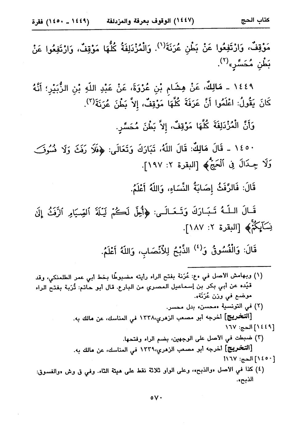 ١٤٥٠ - قَالَ مَالِكٌ: قَالَ اللهُ، تَبَارَكَ وَتَعَالَى: {فَلا رَفَثَ وَلا فُسُوقَ وَلا جِدَالَ فِي الحّجِّ} [البقرة ٢: ١٩٧].