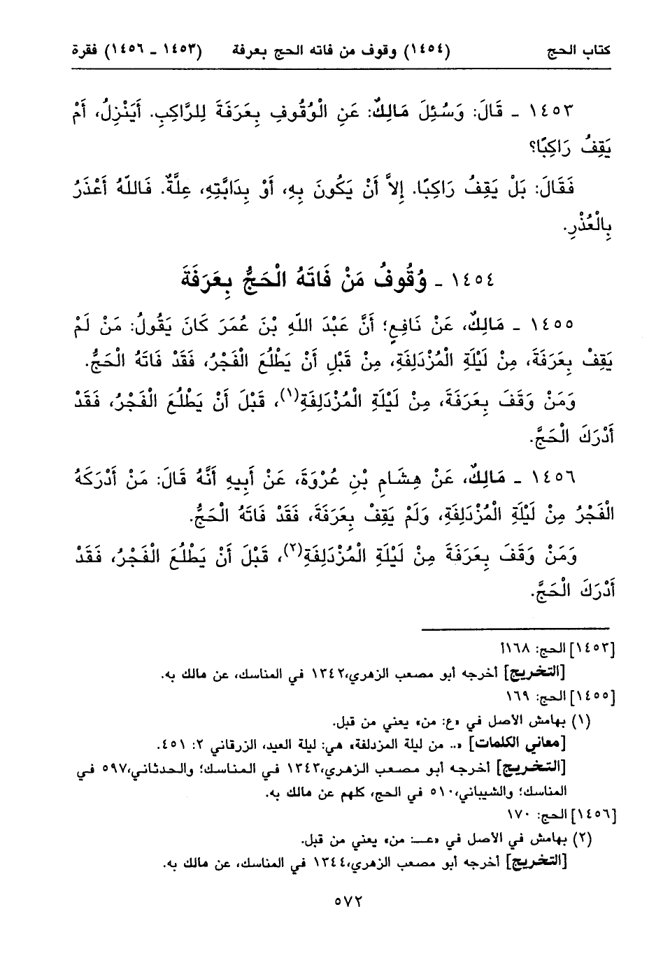 ١٤٥٦ - مَالِكٌ، عَنْ هِشَامِ بْنِ عُرْوَةَ، عَنْ أَبِيهِ أَنَّهُ قَالَ: مَنْ أَدْرَكَهُ الْفَجْرُ مِنْ لَيْلَةِ الْمُزْدَلِفَةِ، وَلَمْ يَقِفْ بِعَرَفَةَ، فَقَدْ فَاتَهُ الْحَجُّ.