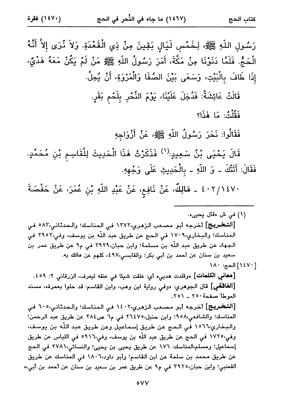 أخرجه أبو مصعب الزهري، ١٤٠٢ في المناسك؛ والحدثاني، ٦٠٥ في المناسك؛ والشافعي، ٩٥٨؛ وابن حنبل، ٢٦٤٧٥ في م٦ ص٢٨٤ عن طريق عبد الرحمن؛ والبخاري، ١٥٦٦ في الحج عن طريق إسماعيل وعن طريق عبد الله بن يوسف، وفي، ١٧٢٥ في الحج عن طريق عبد الله بن يوسف، وفي، ٥٩١٦ في اللباس عن طريق إسماعيل؛ ومسلم، المناسك: ١٧٦ عن طريق يحيى بن يحيى؛ والنسائي، ٢٧٨١ في الحج عن طريق محمد بن سلمة عن ابن القاسم؛ وأبو داود، ١٨٠٦ في المناسك عن طريق القعنبي؛ وابن حبان، ٣٩٢٥ في م٩ عن طريق عمر بن سعيد بن سنان عن أحمد بن أبي بكر؛ وأبي يعلى الموصلي، ٧٠٥٦ عن طريق زهير عن عبد الرحمن؛ والقابسي، ٢٢٢؛ والقابسي، ٢٢٣، كلهم عن مالك به.