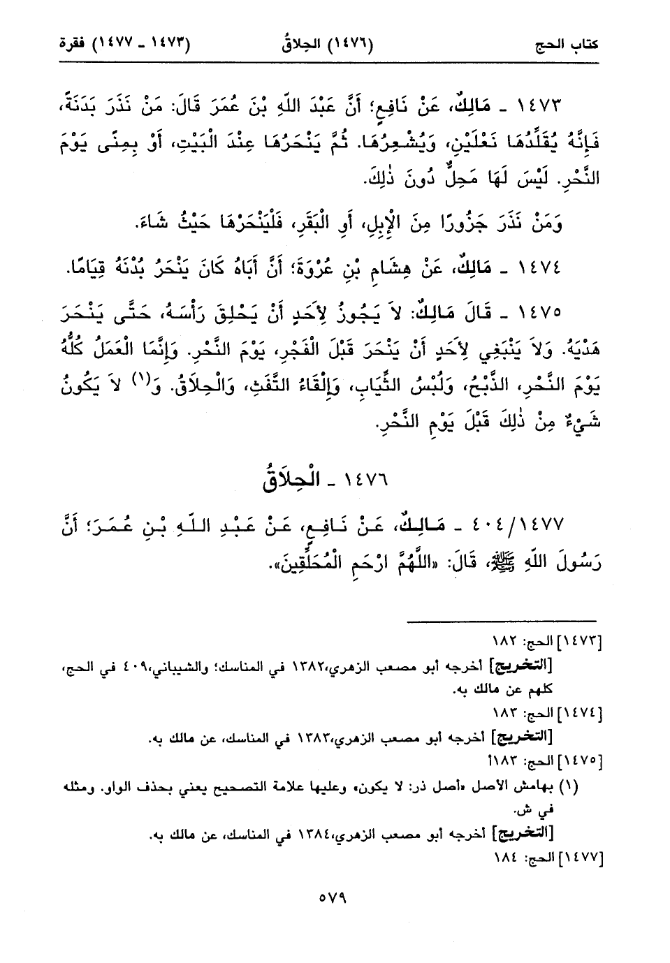 ١٤٧٧/ ٤٠٤ - مَالِكٌ، عَنْ نَافِعٍ، عَنْ عَبْدِ اللهِ بْنِ عُمَرَ؛ أَنَّ رَسُولَ اللهِ صلى الله عليه وسلم، قَالَ: «اللَّهُمَّ ارْحَمِ الْمُحَلِّقِينَ». ⦗٥٨٠⦘