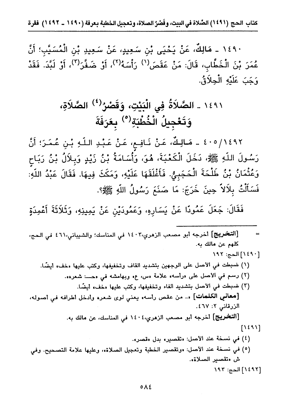 ١٤٩٢/ ٤٠٥ - مَالِكٌ، عَنْ نَافِعٍ، عَنْ عَبْدِ اللهِ بْنِ عُمَرَ؛ أَنَّ رَسُولَ اللهِ صلى الله عليه وسلم، دَخَلَ الْكَعْبَةَ، هُوَ، وَأُسَامَةُ بْنُ زَيْدٍ وَبِلَالُ بْنُ رَبَاحٍ وَعُثْمَانُ بْنُ طَلْحَةَ الْحَجَبِيُّ. فَأَغْلَقَهَا عَلَيْهِ، وَمَكَثَ فِيهَا. فَقَالَ عَبْدُ اللهِ: فَسَأَلْتُ بِلَالاً حِينَ خَرَجَ: مَا صَنَعَ رَسُولُ اللهِ صلى الله عليه وسلم؟.