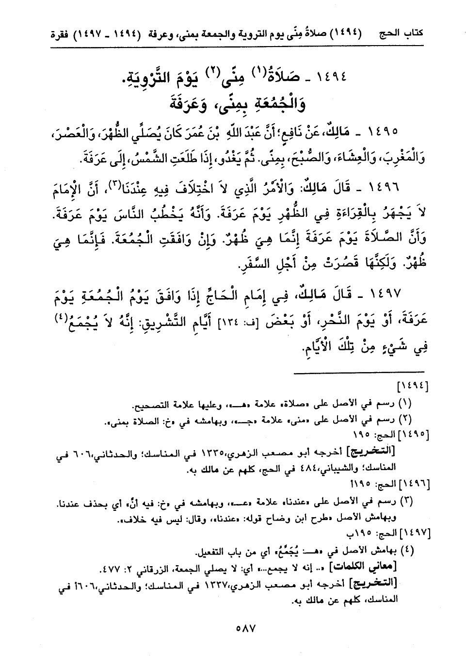 ١٤٩٤ - صَلَاةُ (١) مِنًى (٢) يَوْمَ التَّرْوِيَةِ. وَالْجُمُعَةِ بِمِنًى، وَعَرَفَةَ