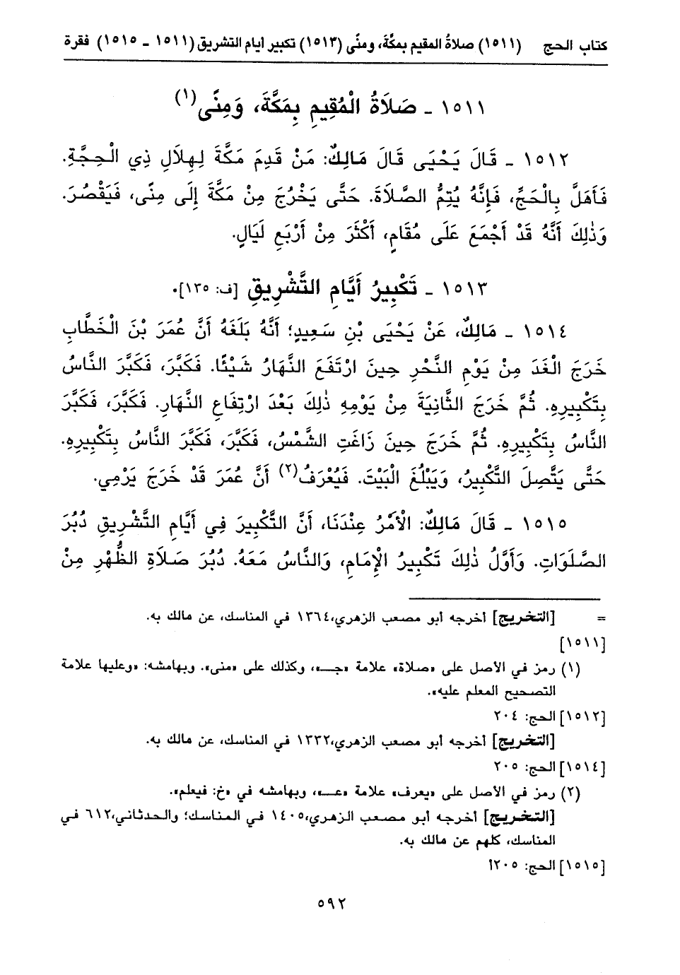 ١٥١٥ - قَالَ مَالِكٌ: الْأَمْرُ عِنْدَنَا، أَنَّ التَّكْبِيرَ فِي أَيَّامِ التَّشْرِيقِ دُبُرَ الصَّلَوَاتِ. وَأَوَّلُ ذلِكَ تَكْبِيرُ الْإِمَامِ، وَالنَّاسُ مَعَهُ. دُبُرَ صَلَاةِ الظُّهْرِ مِنْ ⦗٥٩٣⦘ يَوْمِ النَّحْرِ. وَآخِرُ ذلِكَ تَكْبِيرُ الْإِمَامِ، وَالنَّاسُ مَعَهُ. دُبُرَ صَلَاةِ الصُّبْحِ مِنْ آخِرِ أَيَّامِ التَّشْرِيقِ. ثُمَّ يَقْطَعُ (١) التَّكْبِيرَ (٢).