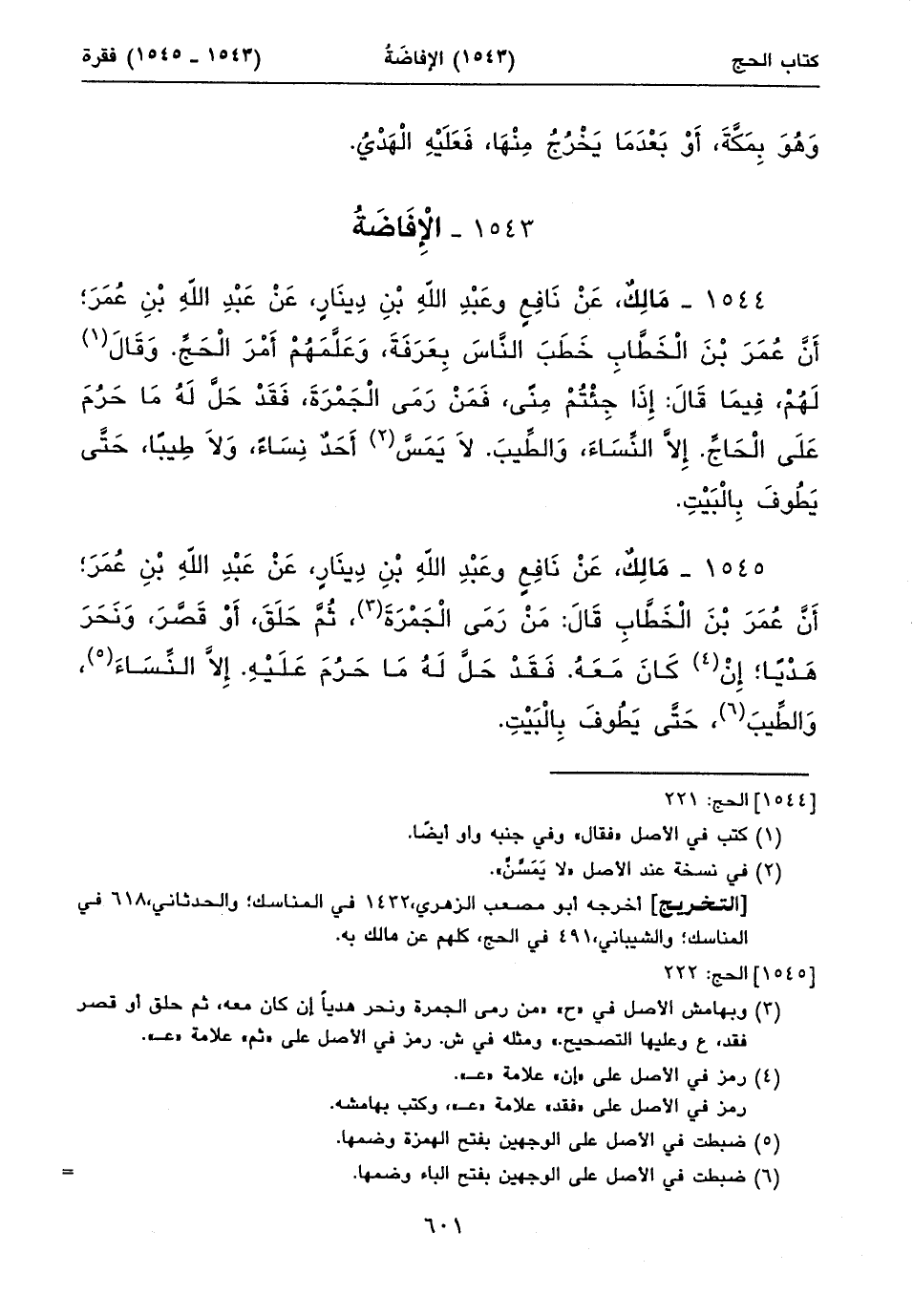 ١٥٤٤ - مَالِكٌ، عَنْ نَافِعٍ وعَبْدِ اللهِ بْنِ دِينَارٍ، عَنْ عَبْدِ اللهِ بْنِ عُمَرَ؛ أَنَّ عُمَرَ بْنَ الْخَطَّابِ خَطَبَ النَّاسَ بِعَرَفَةَ، وَعَلَّمَهُمْ أَمْرَ الْحَجِّ. وَقَالَ (١) لَهُمْ، فِيمَا قَالَ: إِذَا جِئْتُمْ مِنًى، فَمَنْ رَمَى الْجَمْرَةَ، فَقَدْ حَلَّ لَهُ مَا حَرُمَ عَلَى الْحَاجِّ. إِلَاّ النِّسَاءَ، وَالطِّيبَ. لَا يَمَسَّ (٢) أَحَدٌ نِسَاءً، وَلَا طِيباً، حَتَّى يَطُوفَ بِالْبَيْتِ.