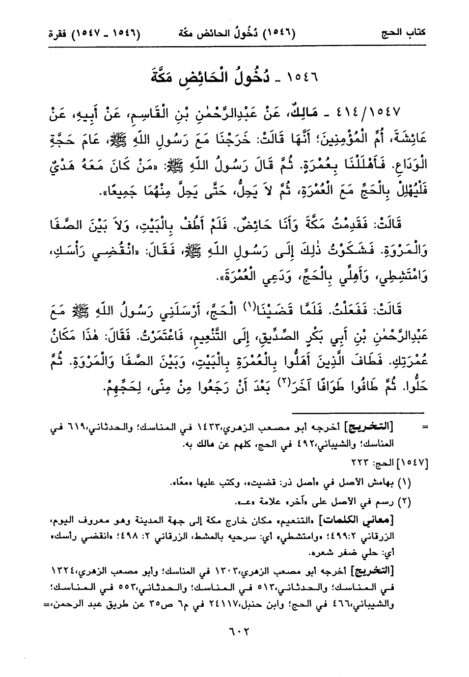 «التنعيم» مكان خارج مكة إلى جهة المدينة وهو معروف اليوم، الزرقاني ٢: ٤٩٩؛ «وامتشطي» أي: سرحيه بالمشط، الزرقاني ٢: ٤٩٨؛ «انقضي رأسك» أي: حلي ضفر شعره.