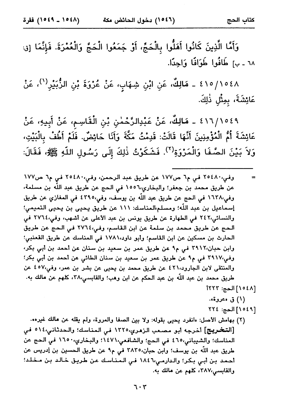 أخرجه أبو مصعب الزهري، ١٣٢٥ في المناسك؛ والحدثاني، ٥١٤ في المناسك؛ والشيباني، ٤٦٥ في الحج؛ والشافعي، ١٤٧١؛ والبخاري، ١٦٥٠ في الحج عن طريق عبد الله بن يوسف؛ وابن حبان، ٣٨٣٥ في م٩ عن طريق الحسين بن إدريس عن أحمد بن أبي بكر؛ والدارمي، ١٨٤٦ في المناسك عن طريق خالد بن مخلد؛ والقابسي، ٣٨٧، كلهم عن مالك به.