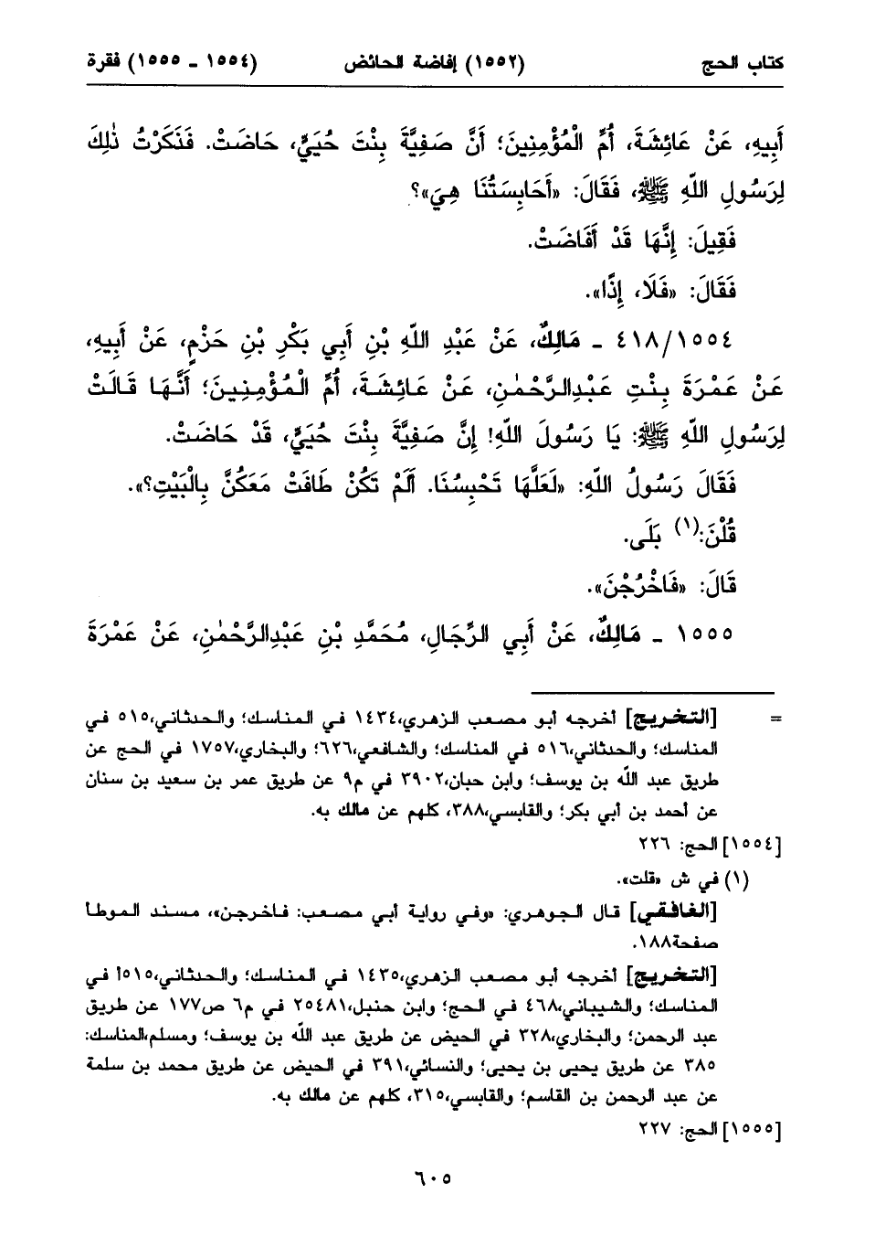 أخرجه أبو مصعب الزهري، ١٤٣٥ في المناسك؛ والحدثاني، ٥١٥أفي المناسك؛ والشيباني، ٤٦٨ في الحج؛ وابن حنبل، ٢٥٤٨١ في م٦ ص١٧٧ عن طريق عبد الرحمن؛ والبخاري، ٣٢٨ في الحيض عن طريق عبد الله بن يوسف؛ ومسلم، المناسك: ٣٨٥ عن طريق يحيى بن يحيى؛ والنسائي، ٣٩١ في الحيض عن طريق محمد بن سلمة عن عبد الرحمن بن القاسم؛ والقابسي، ٣١٥، كلهم عن مالك به.