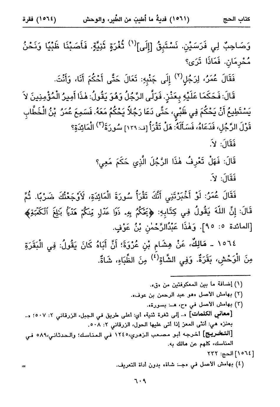 ١٥٦٤ - مَالِكٌ، عَنْ هِشَامِ بْنِ عُرْوَةَ؛ أَنَّ أَبَاهُ كَانَ يَقُولُ: فِي الْبَقَرَةِ مِنَ الْوَحْشِ، بَقَرَةٌ. وَفِي الشَّاةِ (١) مِنَ الظِّبَاءِ، شَاةٌ.