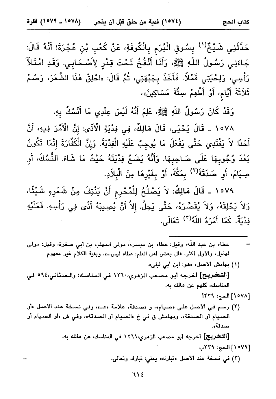 ١٥٧٩ - قَالَ مَالِكٌ: لَا يَصْلُحُ لِلْمُحْرِمِ أَنْ يَنْتِفَ مِنْ شَعَرِهِ شَيْئاً، وَلَا يَحْلِقَهُ، وَلَا يُقَصِّرَهُ، حَتَّى يَحِلَّ. إِلَاّ أَنْ يُصِيبَهُ أَذًى فِي رَأْسِهِ. فَعَلَيْهِ فِدْيَةٌ. كَمَا أَمَرَهُ اللهُ (١) تَعَالَى. ⦗٦١٥⦘