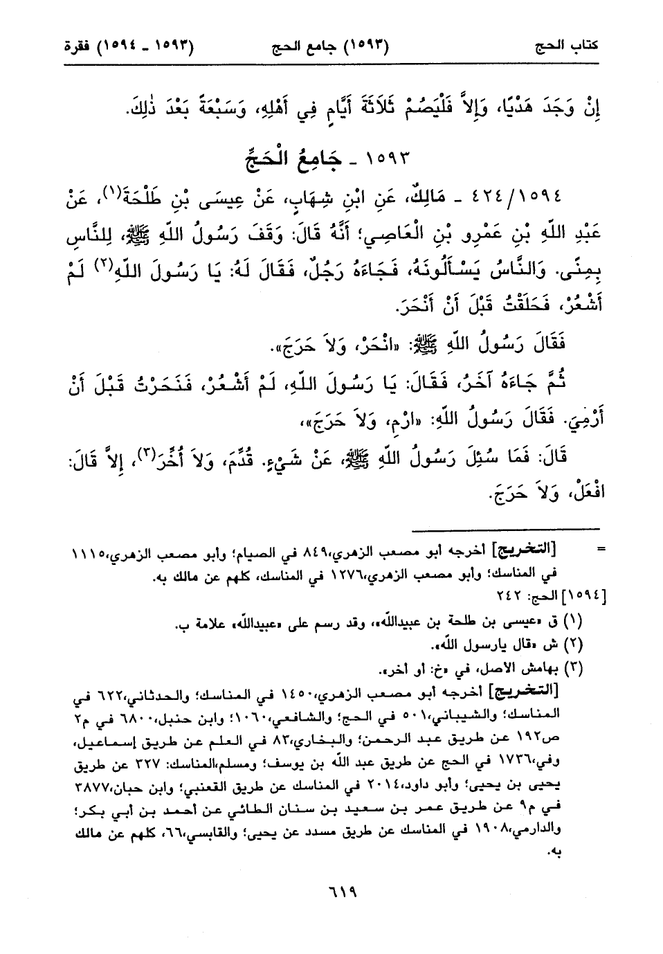١٥٩٤/ ٤٢٤ - مَالِكٌ، عَنِ ابْنِ شِهَابٍ، عَنْ عِيسَى بْنِ طَلْحَةَ (١)، عَنْ عَبْدِ اللهِ بْنِ عَمْرِو بْنِ الْعَاصِي؛ أَنَّهُ قَالَ: وَقَفَ رَسُولُ اللهِ صلى الله عليه وسلم، لِلنَّاسِ بِمِنًى. وَالنَّاسُ يَسْأَلُونَهُ، فَجَاءَهُ رَجُلٌ، فَقَالَ لَهُ: يَا رَسُولَ اللهِ (٢) لَمْ أَشْعُرْ، فَحَلَقْتُ قَبْلَ أَنْ أَنْحَرَ.