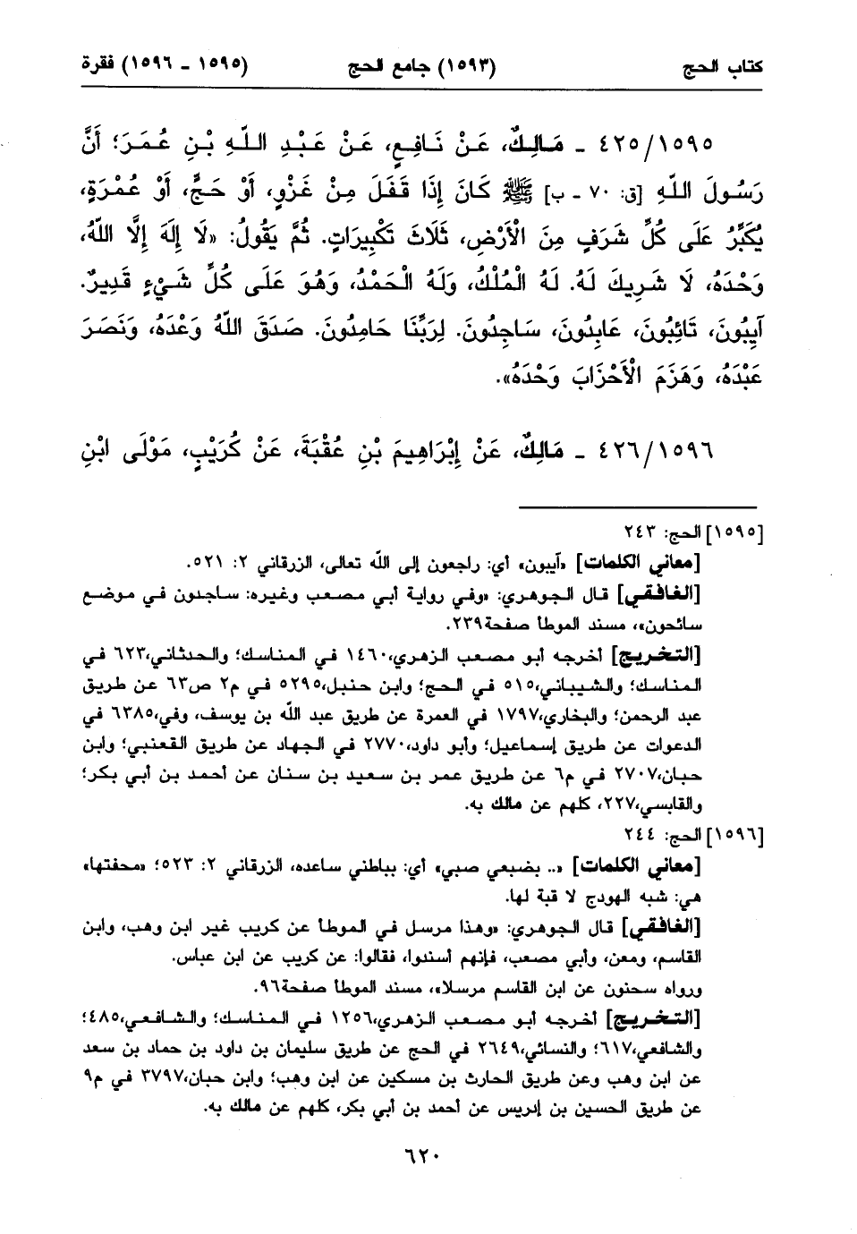 أخرجه أبو مصعب الزهري، ١٤٦٠ في المناسك؛ والحدثاني، ٦٢٣ في المناسك؛ والشيباني، ٥١٥ في الحج؛ وابن حنبل، ٥٢٩٥ في م٢ ص٦٣ عن طريق عبد الرحمن؛ والبخاري، ١٧٩٧ في العمرة عن طريق عبد الله بن يوسف، وفي، ٦٣٨٥ في الدعوات عن طريق إسماعيل؛ وأبو داود، ٢٧٧٠ في الجهاد عن طريق القعنبي؛ وابن حبان، ٢٧٠٧ في م٦ عن طريق عمر بن سعيد بن سنان عن أحمد بن أبي بكر؛ والقابسي، ٢٢٧، كلهم عن مالك به.