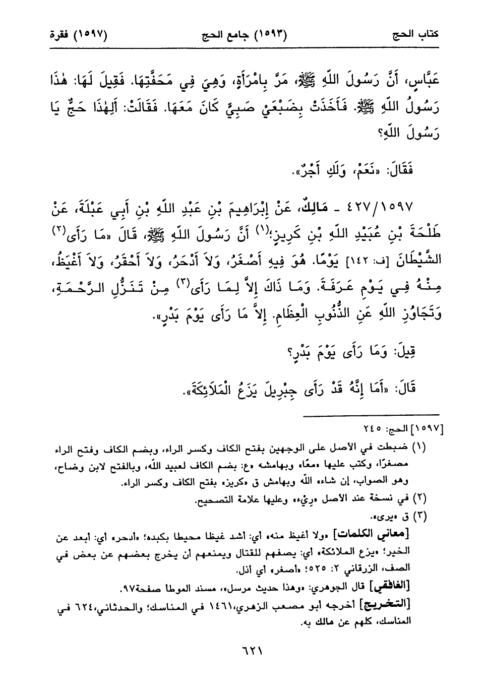 ١٥٩٧/ ٤٢٧ - مَالِكٌ، عَنْ إِبْرَاهِيمَ بْنِ عَبْدِ اللهِ بْنِ أَبِي عَبْلَةَ، عَنْ طَلْحَةَ بْنِ عُبَيْدِ اللهِ بْنِ كَرِيزٍ؛ (١) أَنَّ رَسُولَ اللهِ صلى الله عليه وسلم، قَالَ «مَا رَأَى (٢) الشَّيْطَانَ [ف: ١٤٢] يَوْماً. هُوَ فِيهِ أَصْغَرُ، وَلَا أَدْحَرُ، وَلَا أَحْقَرُ، وَلَا أَغْيَظُ، مِنْهُ فِي يَوْمِ عَرَفَةَ. وَمَا ذَاكَ إِلَاّ لِمَا رَأَى (٣) مِنْ تَنَزُّلِ الرَّحْمَةِ، وَتَجَاوُزِ اللهِ عَنِ الذُّنُوبِ الْعِظَامِ. إِلَاّ مَا رَأَى يَوْمَ بَدْرٍ».