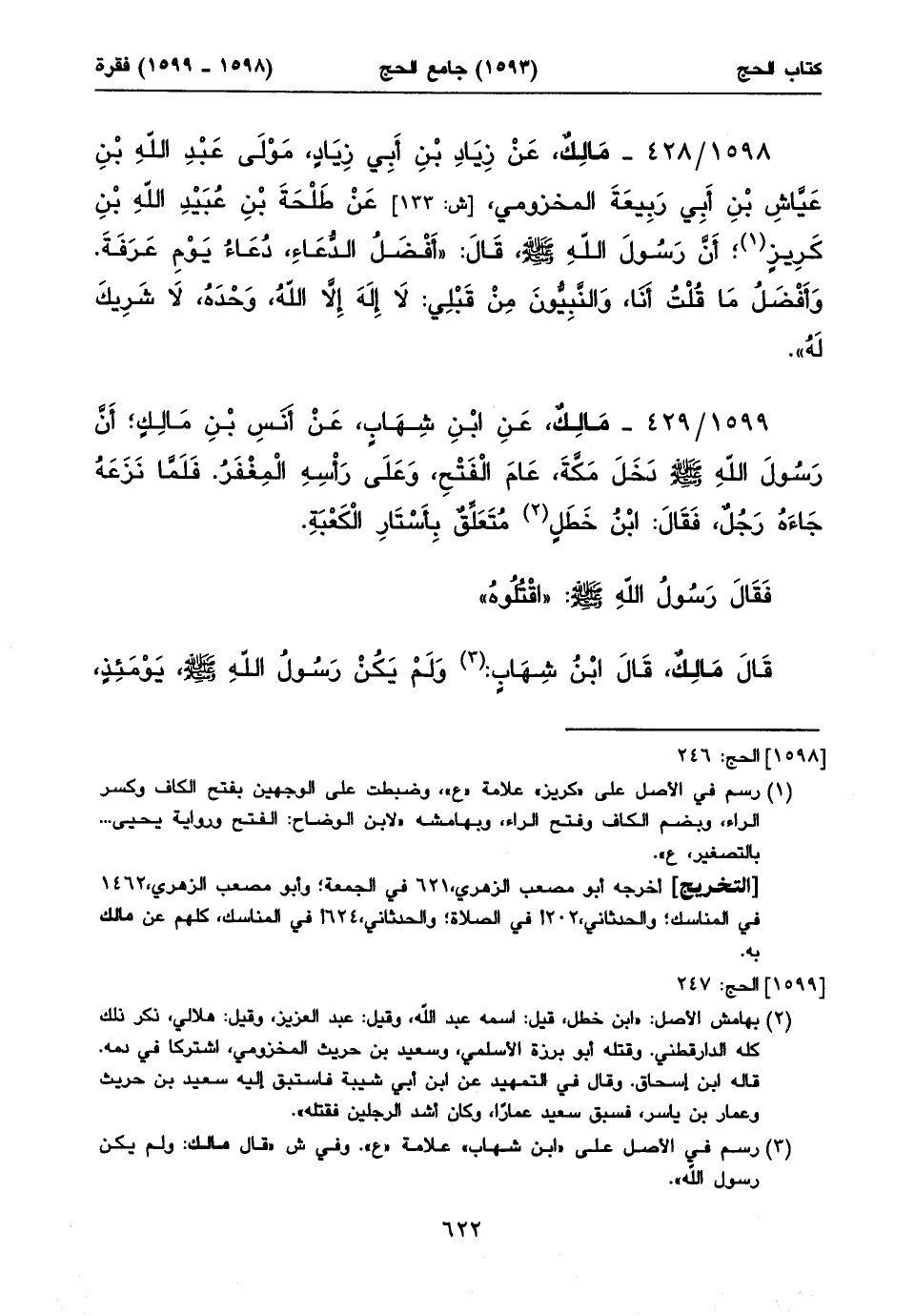 ١٥٩٨/ ٤٢٨ - مَالِكٌ، عَنْ زِيَادِ بْنِ أَبِي زِيَادٍ، مَوْلَى عَبْدِ اللهِ بْنِ عَيَّاشِ بْنِ أَبِي رَبِيعَةَ المخزومي، [ش: ١٣٣] عَنْ طَلْحَةَ بْنِ عُبَيْدِ اللهِ بْنِ كَرِيزٍ (١)؛ أَنَّ رَسُولَ اللهِ صلى الله عليه وسلم، قَالَ: «أَفْضَلُ الدُّعَاءِ، دُعَاءُ يَوْمِ عَرَفَةَ. وَأَفْضَلُ مَا قُلْتُ أَنَا، وَالنَّبِيُّونَ مِنْ قَبْلِي: لَا إِلَهَ إِلَاّ اللهُ، وَحْدَهُ، لَا شَرِيكَ لَهُ».