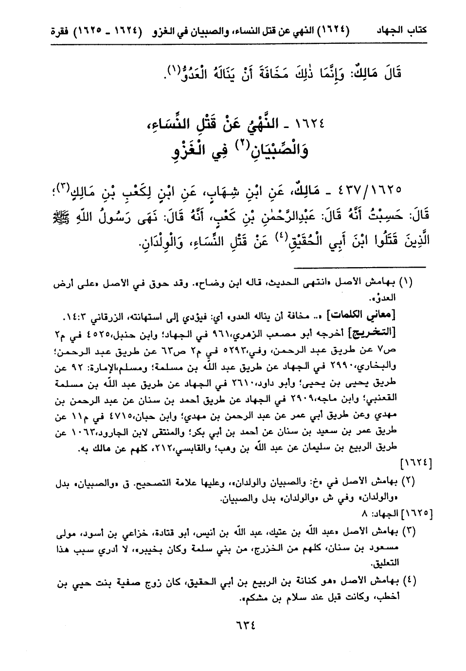 ١٦٢٥/ ٤٣٧ - مَالِكٌ، عَنِ ابْنِ شِهَابٍ، عَنِ ابْنٍ لِكَعْبِ بْنِ مَالِكٍ (١)؛ قَالَ: حَسِبْتُ أَنَّهُ قَالَ: عَبْدِ الرَّحْمنِ بْنِ كَعْبٍ، أَنَّهُ قَالَ: نَهَى رَسُولُ اللهِ صلى الله عليه وسلم الَّذِينَ قَتَلُوا ابْنَ أَبِي الْحُقَيْقِ (٢) عَنْ قَتْلِ النِّسَاءِ، وَالْوِلْدَانِ. ⦗٦٣٥⦘