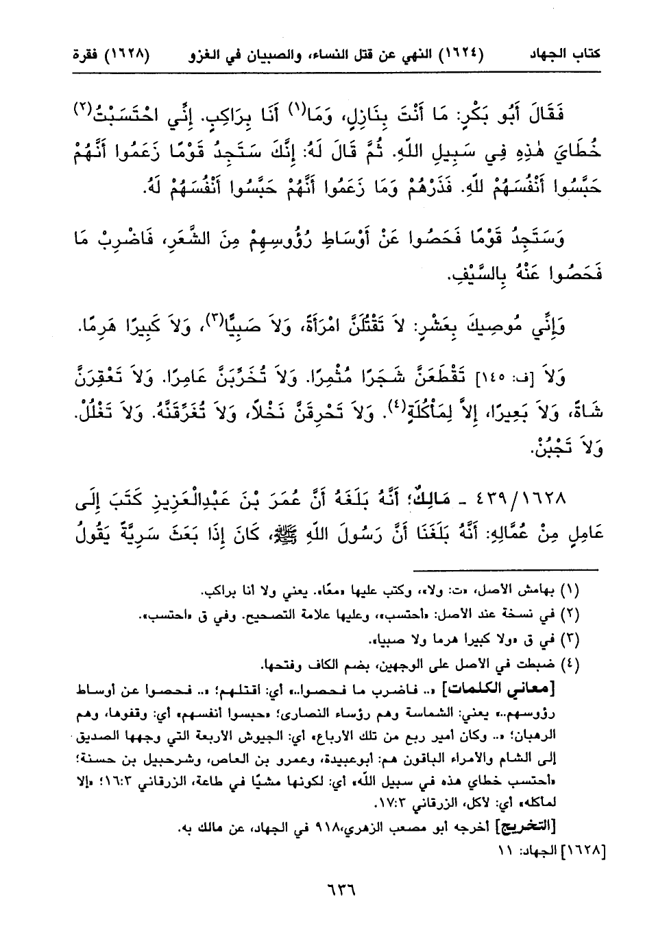 ١٦٢٨/ ٤٣٩ - مَالِكٌ؛ أَنَّهُ بَلَغَهُ أَنَّ عُمَرَ بْنَ عَبْدِ الْعَزِيزِ كَتَبَ إِلَى عَامِلٍ مِنْ عُمَّالِهِ: أَنَّهُ بَلَغَنَا أَنَّ رَسُولَ اللهِ صلى الله عليه وسلم، كَانَ إِذَا بَعَثَ سَرِيَّةً يَقُولُ ⦗٦٣٧⦘ لَهُمْ: اغْدُوا (١) بِاسْمِ اللهِ، فِي سَبِيلِ اللهِ، تُقَاتِلُونَ مَنْ كَفَرَ بِاللهِ. لَا تَغُلُّوا. وَلَا تَغْدِرُوا. وَلَا تُمَثِّلُوا (٢)، وَلَا تَقْتُلُوا وَلِيداً.
