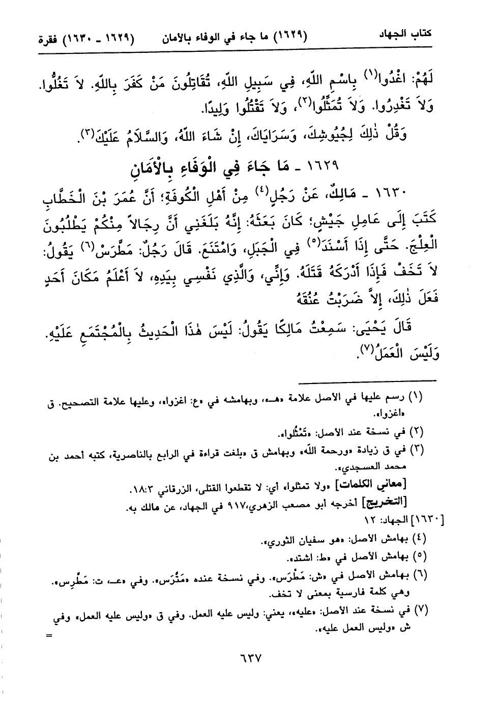 ١٦٣٠ - مَالِكٌ، عَنْ رَجُلٍ (١) مِنْ أَهْلِ الْكُوفَةِ؛ أَنَّ عُمَرَ بْنَ الْخَطَّابِ كَتَبَ إِلَى عَامِلِ جَيْشٍ؛ كَانَ بَعَثَهُ: إِنَّهُ بَلَغَنِي أَنَّ رِجَالاً مِنْكُمْ يَطْلُبُونَ الْعِلْجَ. حَتَّى إِذَا أَسْنَدَ (٢) فِي الْجَبَلِ، وَامْتَنَعَ. قَالَ رَجُلٌ: مَطَّرَسْ (٣) يَقُولُ: لَا تَخَفْ فَإِذَا أَدْرَكَهُ قَتَلَهُ. وَإِنِّي، وَالَّذِي نَفْسِي بِيَدِهِ، لَا أَعْلَمُ مَكَانَ أَحَدٍ فَعَلَ ذلِكَ، إِلَاّ ضَرَبْتُ عُنُقَهُ
