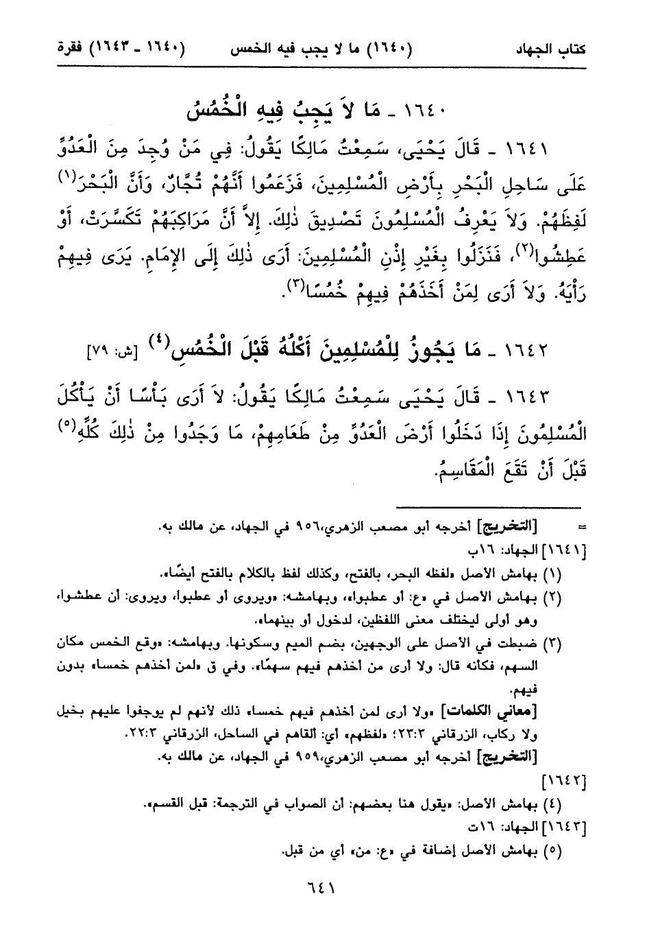 «ولا أرى لمن أخذهم فيهم خمسا» ذلك لأنهم لم يوجفوا عليهم بخيل ولا ركاب، الزرقاني ٣: ٢٣؛ «لفظهم» أي: ألقاهم في الساحل، الزرقاني ٣: ٢٢