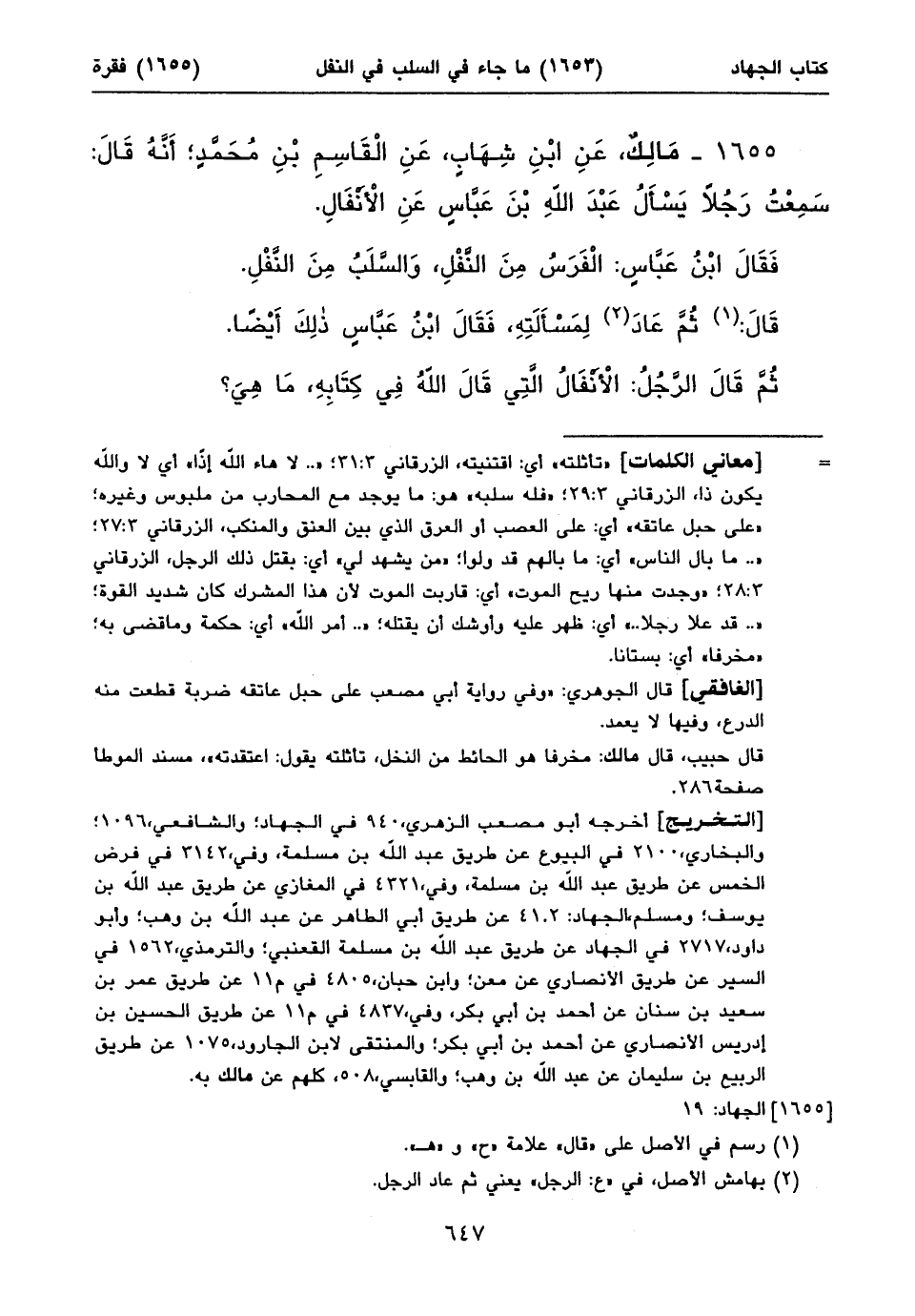 ١٦٥٥ - مَالِكٌ، عَنِ ابْنِ شِهَابٍ، عَنِ الْقَاسِمِ بْنِ مُحَمَّدٍ؛ أَنَّهُ قَالَ: سَمِعْتُ رَجُلاً يَسْأَلُ عَبْدَ اللهِ بْنَ عَبَّاسٍ عَنِ الْأَنْفَالِ.
