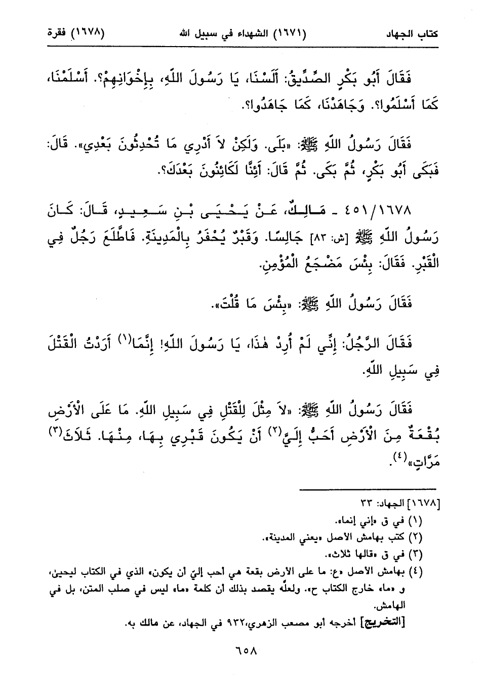 فَقَالَ رَسُولُ اللهِ صلى الله عليه وسلم: «لَا مِثْلَ لِلْقَتْلِ فِي سَبِيلِ اللهِ. مَا عَلَى الْأَرْضِ بُقْعَةٌ مِنَ الْأَرْضِ أَحَبُّ إِلَيَّ (٢) أَنْ يَكُونَ قَبْرِي بِهَا، مِنْهَا. ثَلَاثَ (٣) مَرَّاتٍ» (٤).