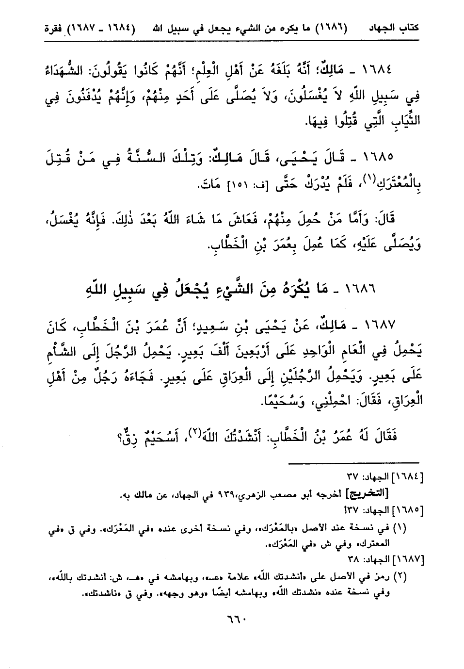 ١٦٨٤ - مَالِكٌ؛ أَنَّهُ بَلَغَهُ عَنْ أَهْلِ الْعِلْمِ؛ أَنَّهُمْ كَانُوا يَقُولُونَ: الشُّهَدَاءُ فِي سَبِيلِ اللهِ لَا يُغْسَلُونَ، وَلَا يُصَلَّى عَلَى أَحَدٍ مِنْهُمْ، وَإِنَّهُمْ يُدْفَنُونَ فِي الثِّيَابِ الَّتِي قُتِلُوا فِيهَا.