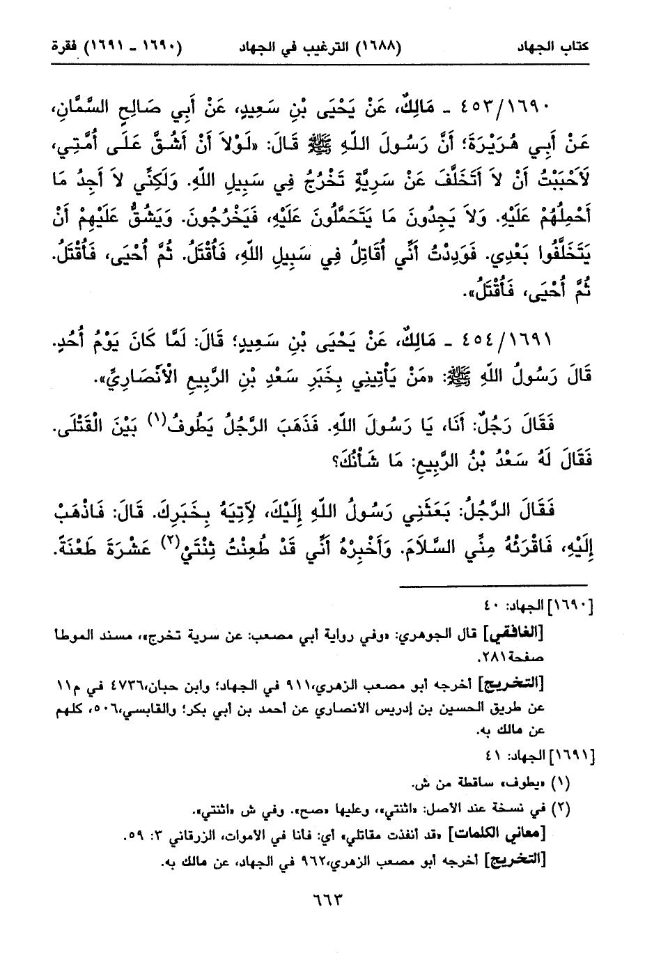 ١٦٩٠/ ٤٥٣ - مَالِكٌ، عَنْ يَحْيَى بْنِ سَعِيدٍ، عَنْ أَبِي صَالِحٍ السَّمَّانِ، عَنْ أَبِي هُرَيْرَةَ؛ أَنَّ رَسُولَ اللهِ صلى الله عليه وسلم قَالَ: «لَوْلَا أَنْ أَشُقَّ عَلَى أُمَّتِي، لأَحْبَبْتُ أَنْ لَا أَتَخَلَّفَ عَنْ سَرِيَّةٍ تَخْرُجُ فِي سَبِيلِ اللهِ. وَلَكِنِّي لَا أَجِدُ مَا أَحْمِلُهُمْ عَلَيْهِ. وَلَا يَجِدُونَ مَا يَتَحَمَّلُونَ عَلَيْهِ، فَيَخْرُجُونَ. وَيَشُقُّ عَلَيْهِمْ أَنْ يَتَخَلَّفُوا بَعْدِي. فَوَدِدْتُ أَنِّي أُقَاتِلُ فِي سَبِيلِ اللهِ، فَأُقْتَلُ. ثُمَّ أُحْيَى، فَأُقْتَلُ. ثُمَّ أُحْيَى، فَأُقْتَلُ».
