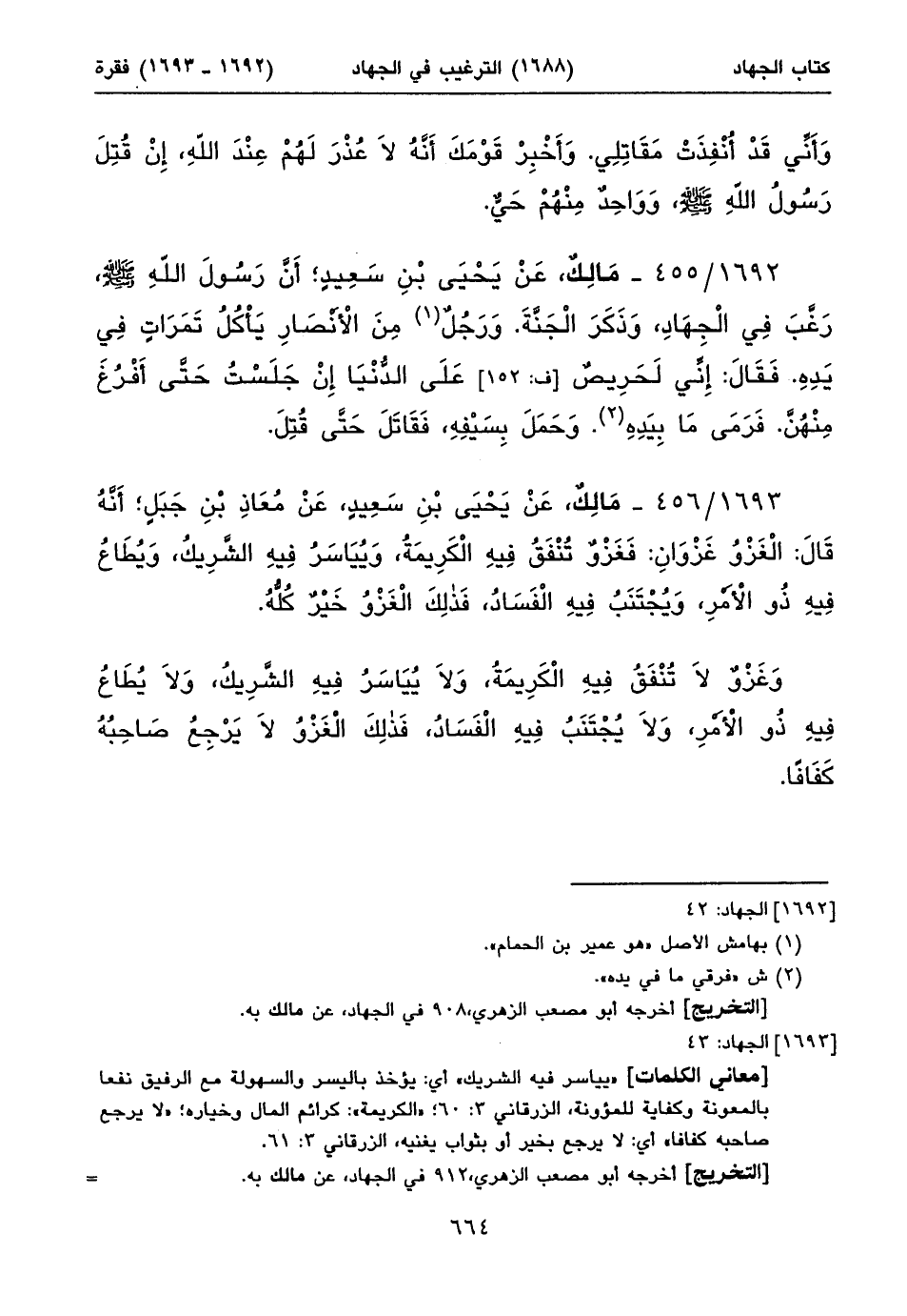 ١٦٩٣/ ٤٥٦ - مَالِكٌ، عَنْ يَحْيَى بْنِ سَعِيدٍ، عَنْ مُعَاذِ بْنِ جَبَلٍ؛ أَنَّهُ قَالَ: الْغَزْوُ غَزْوَانِ: فَغَزْوٌ تُنْفَقُ فِيهِ الْكَرِيمَةُ، وَيُيَاسَرُ فِيهِ الشَّرِيكُ، وَيُطَاعُ فِيهِ ذُو الْأَمْرِ، وَيُجْتَنَبُ فِيهِ الْفَسَادُ، فَذلِكَ الْغَزْوُ خَيْرٌ كُلُّهُ.