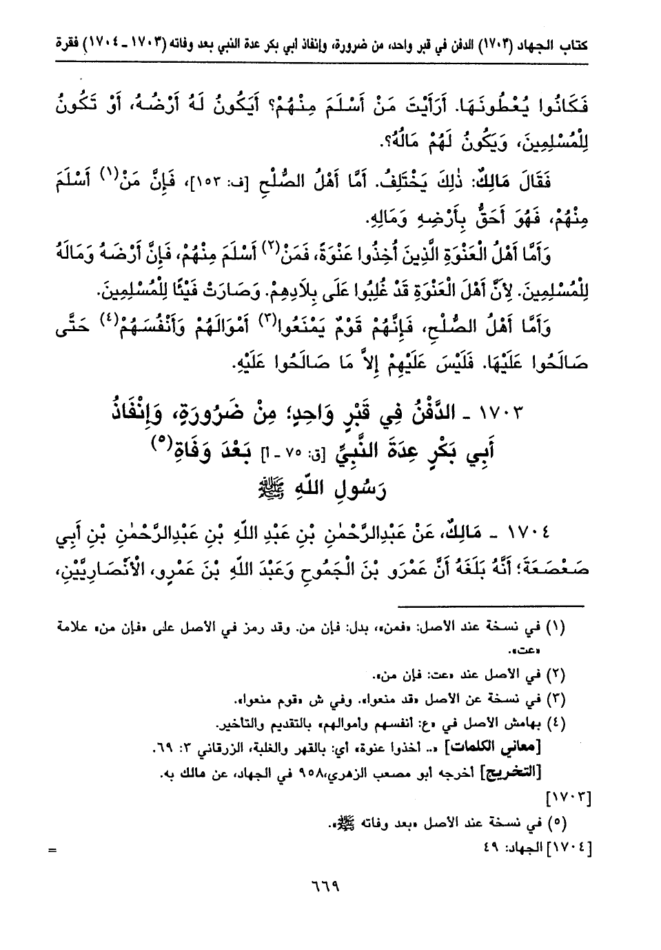 ١٧٠٤ - مَالِكٌ، عَنْ عَبْدِ الرَّحْمنِ بْنِ عَبْدِ اللهِ بْنِ عَبْدِ الرَّحْمنِ بْنِ أَبِي صَعْصَعَةَ؛ أَنَّهُ بَلَغَهُ أَنَّ عَمْرَو بْنَ الْجَمُوحِ وَعَبْدَ اللهِ بْنَ عَمْرٍو، الْأَنْصَارِيَّيْنِ، ⦗٦٧٠⦘ ثُمَّ السَّلَمِيَّيْنِ، كَانَا قَدْ حَفَرَ السَّيْلُ قَبْرَهُمَا. وَكَانَ قَبْرُهُمَا مِمَّا يَلِي السَّيْلَ. وَكَانَا فِي قَبْرٍ وَاحِدٍ. وَكَانَا (١) مِمَّنِ اسْتُشْهِدَ يَوْمَ أُحُدٍ. فَحُفِرَ عَنْهُمَا لِيُغَيَّرَا مِنْ مَكَانِهِمَا، فَوُجِدَا لَمْ يَتَغَيَّرَا، كَأَنَّمَا (٢) مَاتَا بِالْأَمْسِ. وَكَانَ أَحَدُهُمَا قَدْ جُرِحَ، فَوَضَعَ يَدَهُ عَلَى جُرْحِهِ، فَدُفِنَ وَهُوَ كَذلِكَ، فَأُمِيطَتْ يَدُهُ عَنْ جُرْحِهِ، ثُمَّ أُرْسِلَتْ، فَرَجَعَتْ كَمَا كَانَتْ. وَكَانَ بَيْنَ أُحُدٍ، وَبَيْنَ يَوْمَ حُفِرَ عَنْهُمَا، سِتٌّ وَأَرْبَعُونَ سَنَةً.