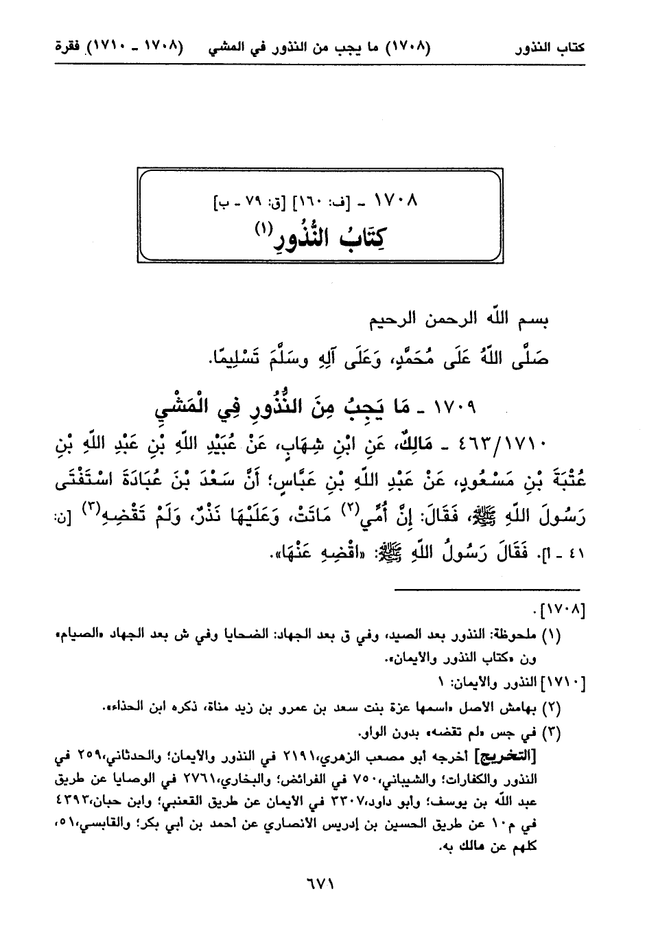 ١٧٠٨ - [ف: ١٦٠] [ق: ٧٩ - ب] كِتَابُ النُّذُورِ (١)