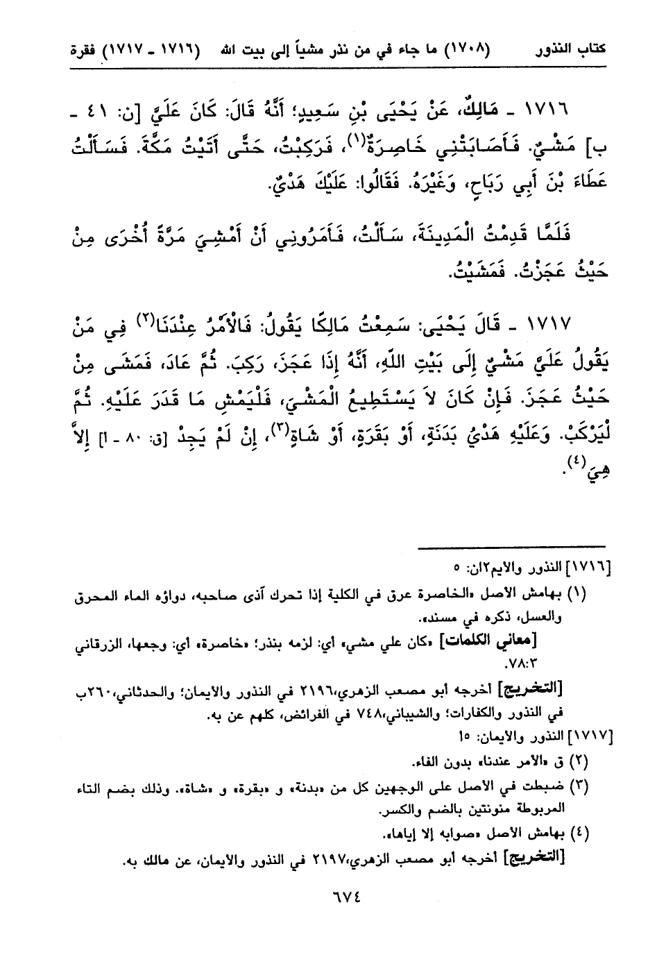 ١٧١٦ - مَالِكٌ، عَنْ يَحْيَى بْنِ سَعِيدٍ؛ أَنَّهُ قَالَ: كَانَ عَلَيَّ [ن: ٤١ - ب] مَشْيٌ. فَأَصَابَتْنِي خَاصِرَةٌ (١)، فَرَكِبْتُ، حَتَّى أَتَيْتُ مَكَّةَ. فَسَأَلْتُ عَطَاءَ بْنَ أَبِي رَبَاحٍ، وَغَيْرَهُ. فَقَالُوا: عَلَيْكَ هَدْيٌ.