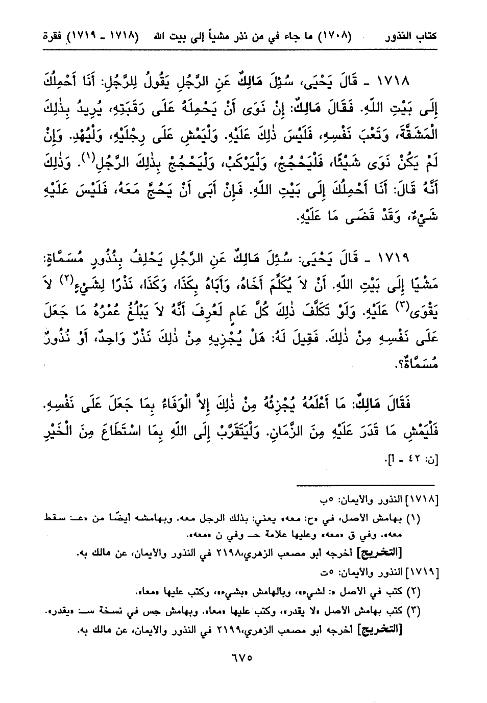 ١٧١٨ - قَالَ يَحْيَى، سُئِلَ مَالِكٌ عَنِ الرَّجُلِ يَقُولُ لِلرَّجُلِ: أَنَا أَحْمِلُكَ إِلَى بَيْتِ اللهِ. فَقَالَ مَالِكٌ: إِنْ نَوَى أَنْ يَحْمِلَهُ عَلَى رَقَبَتِهِ، يُرِيدُ بِذلِكَ الْمَشَقَّةَ، وَتَعْبَ نَفْسِهِ، فَلَيْسَ ذلِكَ عَلَيْهِ. وَلْيَمْشِ عَلَى رِجْلَيْهِ، وَلْيُهْدِ. وَإِنْ لَمْ يَكُنْ نَوَى شَيْئاً، فَلْيَحْجُجْ، وَلْيَرْكَبْ، وَلْيَحْجُجْ بِذلِكَ الرَّجُلِ (١). وَذلِكَ أَنَّهُ قَالَ: أَنَا أَحْمِلُكَ إِلَى بَيْتِ اللهِ. فَإِنْ أَبَى أَنْ يَحُجَّ مَعَهُ، فَلَيْسَ عَلَيْهِ شَيْءٌ، وَقَدْ قَضَى مَا عَلَيْهِ.